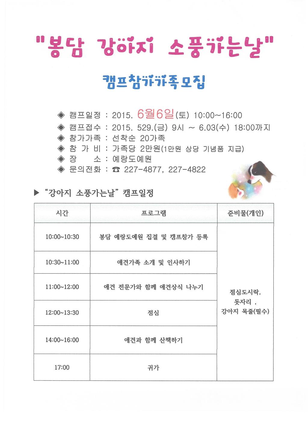 "봉담 강아지 소풍가는날" 캠프가족모집(메르스:중동호흡기증후군으로 인하여 무기한 연기되었습니다.) 작성자박미연|작성시간15.05.28|조회수108 목록 댓글 0 글자크기 작게가 글자크기 크게가 다음검색 현재 게시글 추가 기능 열기 북마크 공유하기 신고 센터로 신고 댓글 댓글 0 댓글쓰기 답글쓰기 댓글 리스트