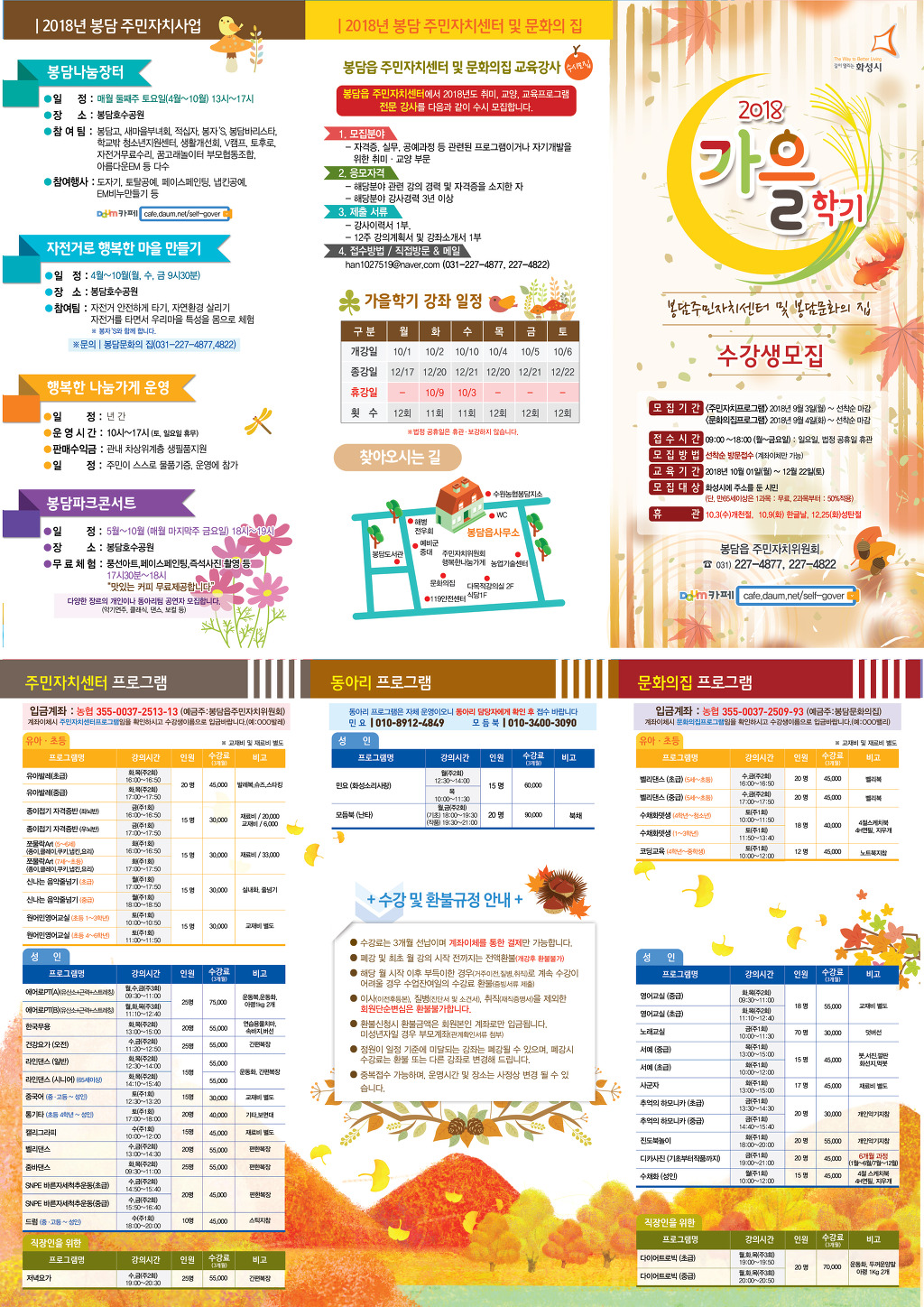 접수기간: 주민자치프로그램 2018년 9월 3일(월)09시~ 선착순마감
