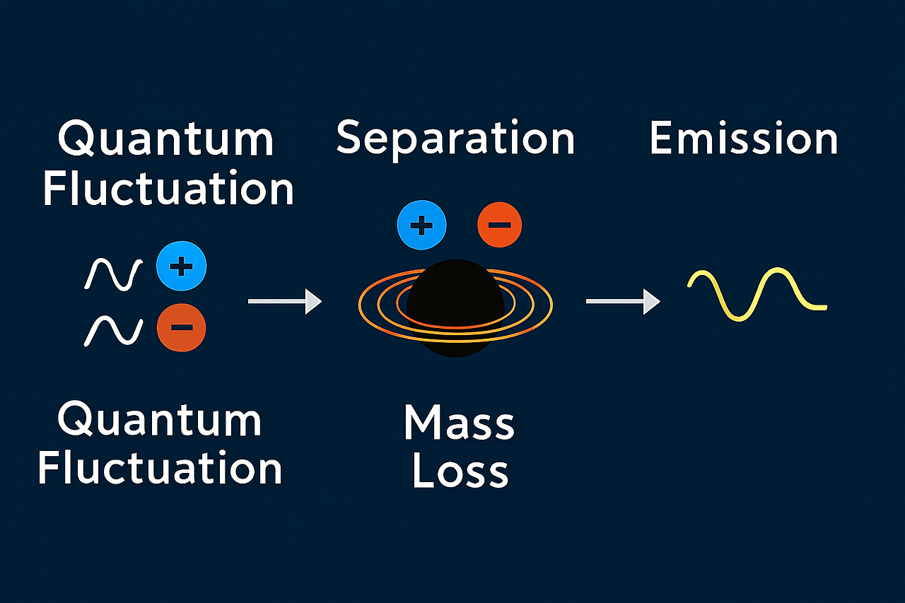 4. 방출 Emission → 밖으로 나온 입자는 실제 입자·복사 에너지로 나타남 ( + 입자는 실제 복사 에너지로 방출됨 (광자 등)) 이 과정이 바로 호킹 복사(Hawking Radiation)