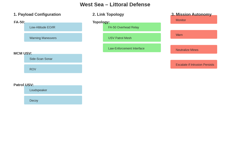 - 페이로드: FA-50 저고도 EO/IR, 경고 비행 / MCM USV 사이드스캔·ROV / 경비 USV 확성기·디코이
