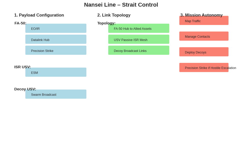 | 난세이 라인 | 해협 다수, 중국 해군·해경 활동 빈번 | 해협 ISR·연합 작전·양동·기만 | FA-50(연합 링크·정밀 타격·가시성 운용) + ISR USV + 디코이 스웜 | 연합 억제력 강화, 충돌 회피, 해협 통제권 유지 |