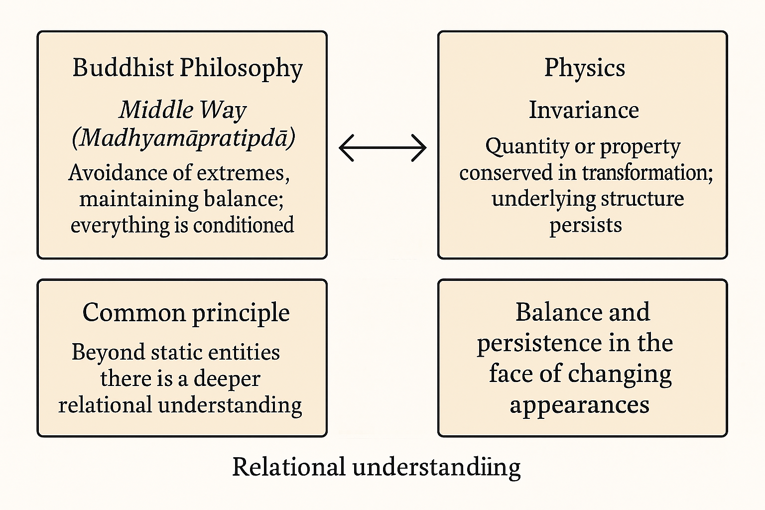 불교 철학의 중도(中道)와 물리학의 불변량(invariance) 개념 사이의 구조적 연결을 확인할 수 있습니다.