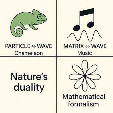 ◎ 이 비교를 직관적 비유로 풀어 보겠습니다. 예를 들어, “입자 ↔ 파동”은 카멜레온처럼 상황에 따라 성질이 바뀌는 존재, “행렬 ↔ 파동”은 같은 이야기를 소설로 쓰거나 영화로 표현하는 차이라고 설명할 수 있습니다.