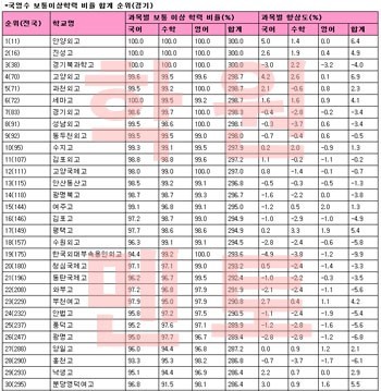 경기 지역 전체 430여 개 고등학교 중에서 안양외고, 진성고, 경기북과고, 고양외고, 과천외고, 세마고, 경기외고, 성남외고, 동두천외고, 수지고, 김포외고, 고양국제고, 안산동산고