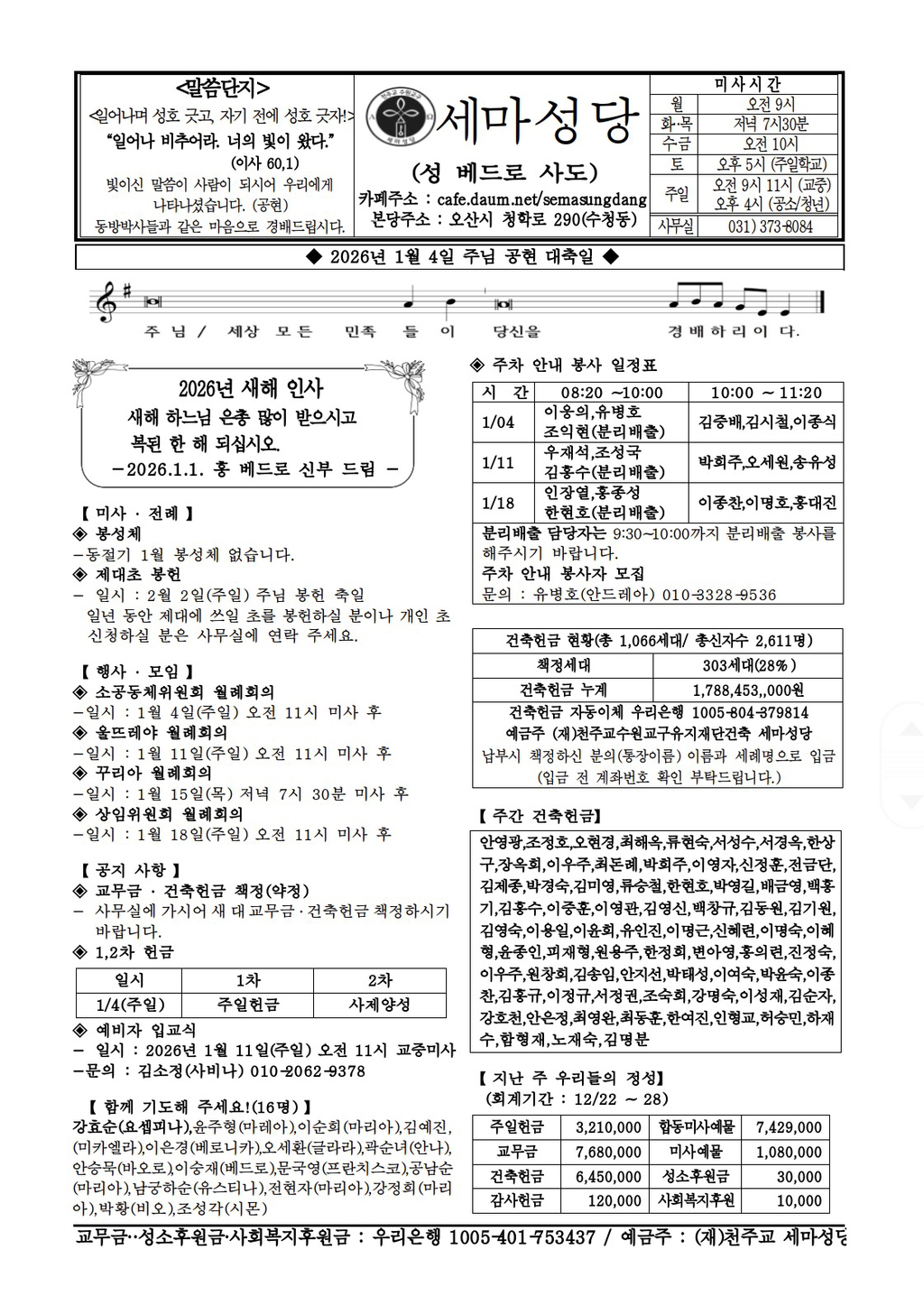 2026년1월4일 주님 공헌 대축일 주보 작성자홍보분과장 권병준 스테파노|작성시간26.01.02|조회수190 목록 댓글 0 글자크기 작게가 글자크기 크게가 다음검색 현재 게시글 추가 기능 열기 북마크 공유하기 신고 센터로 신고 댓글 댓글 0 댓글쓰기 답글쓰기 댓글 리스트