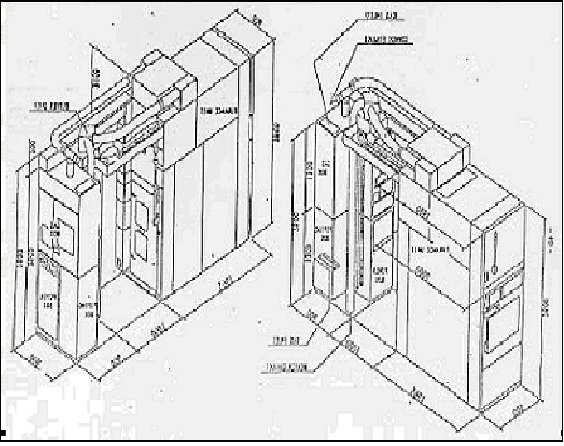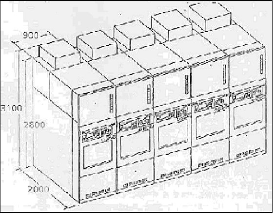 그림 1‐1에는 전방‐우측에서 바라본 VERTICAL FURNACE의 모습과 후방‐좌측측에서 바라본 모습이 장치의 대략적인 크기와 함께 잘 나타나 있다. 또한 그림 1‐2에서는 여러 댓 수의 VERTICAL FURNACE를 설치했을 때의 장치의 배열을 보여 주고 있다.