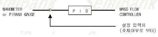 압력 제어는 주제어부에서 REMOTE되어 제어된 디지털 연산제어식 압력계에 의해 MONOMETER 또는 PIRANI GAUGE의 실제 측정한 압력치와 주제어측에서 설정된 압력치와의 편차를 PID 연산에 의해서 MASS FLOW CONTROLLER을 직접 제어하는 DDC(DIRECT DIGITAL CONTROLLER)을 사용하고 있다. 각 GAS LINE은 독립적이고, 제어 방식은 그림1‐7과 같다.