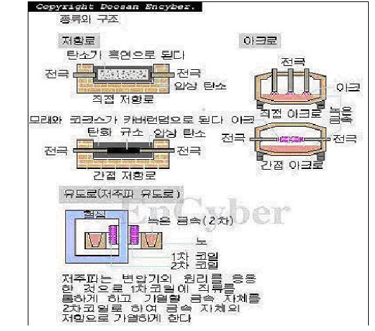 ③ 유도로 : 피가열물에 교류자기장을 가하여, 이 자기장에 의해서 피가열물 속으로 전류가 흘러 용융하는 것으로, 금속을 정제하는 데 사용되는 노이다. 따라서 유도로에는 이것을 둘러싼 코일이 있다. 이 코일에 보내는 교류의 주파수가 50 ~ 60Hz인 것을 저주파 유도로, l만 Hz 이상의 것을 고주파 유도로, l만 Hz 이하를 중간주파 유도로라고 한다. 중간 및 고주파로의 전원은 10khz까지는 고주파 발전기, 주파수가 그 이상인 것은 불꽃발진기․진공관발진기 등에 의한다. 발전기의 용량은 수kw에서 큰 것은 2,000kw급의 것도 있다.