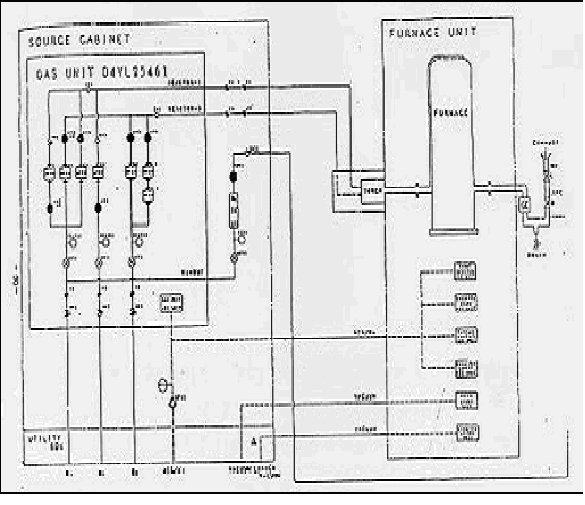 GAS관련의 모든 UTILITY들은 우선 이 GAS 공급실을 통해서 FURNACE 장치내의 각 필요한 곳에 연결 된 배관을 통해 GAS를 공급하는데, 안전을 위하여 항상 강제 배기가 되도록 되어 있고 GAS의 유량을 제어할 수 있는 MFC(MASS FLOW CONTROLLER)및 MFM (MASS FLOWMETER), 공급 GAS의 PARTICLE을 최종 걸러주는 필터(FILTER), GAS의 공급과 차단을 하기 위한 밸브(VALVE) GAS의 공급압을 조절할 수 있는 REGULATOR 등이 부착되어 있다. 공정용 GAS는 배관을 통해 고온로에 공급되는데, 이때 배관 또는 배관에 부착되어 있는 부품 등의 내부면이 거칠면 GAS가 흘러갈 때 PARTICLE을 발생시킬 수 있으므로 내부에 특수한 처리(EP처리 또는 UC처리)가 필요하다. 그림 1‐6에는 열산화 FURNACE 장치의 GAS 계통도를 보여 주고 있다.