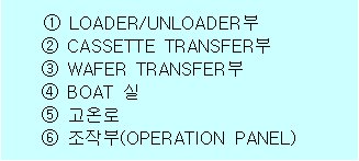 ⑥ 조작부는 LOADER/UNLOADER부를 통해 웨이퍼를 장치내로 반입(LOADING)하여 공정 완료후 다시 LOADER/UNLOADER부로 반출(UNLOAD)하기까지의 모든 구동부의 제어 조건과 공정 조건등 작업절차의 순서를 편집하거나 결과를 MONITOR하는 부분으로 장치내의 각 제어기와 정보를 주고 받으면서 전반적인 FURNACE 장치의 제어를 담당한다.