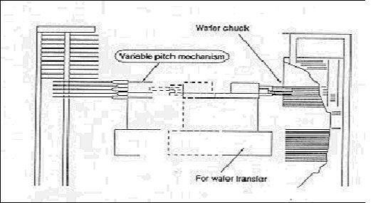 WAFER CASSETTE와 BOAT에서 PITCH가 다를 경우에는 WAFER CHUCK의 PITCH 가변 기구를 사용해서 조정할 수 가 있다. 또는, 낱장으로 동작할 경우에는 WAFER CHUCK의 회전 기구에 의해 5장의 WAFER CHUCK중에 4장을 회전시켜 1장만 동작시킬 수 도 있다.