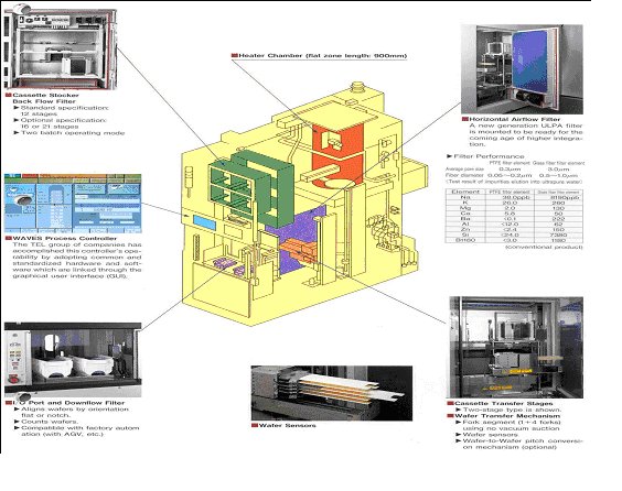 그림에서 알 수 있듯이 통상 VERTICAL FURNACE의 배열은 일렬로 나란히 배치하는데 이때 주의하지 않으면 안되는 것은 상호오염(Cross‐ Contamination)의 가능성이 있는 공정끼리는 같이 배열하지 않는 것이 좋다. 왜냐하면, 장치간 격리는 물론 되어 있다할지라도 FAB내의 공조 때문에 기류를 타고 오염원이 다른 장치 내로 유입될 가능성이 있기 때문이다.