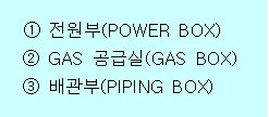 ③ 배관부(PIPING BOX)는 장치에 공급되는 COOLING WATER의 PIPE관이 설치되어 있는 부분으로 각 UNIT간 AIR나 VACUUM LINE의 연결은 이곳을 통하여 지나간다. COOLING WATER는 고온로에서 발산되는 열로부터 장치 및 부품을 보호하기 위해 이곳으로부터 필요한 곳에 공급된다.