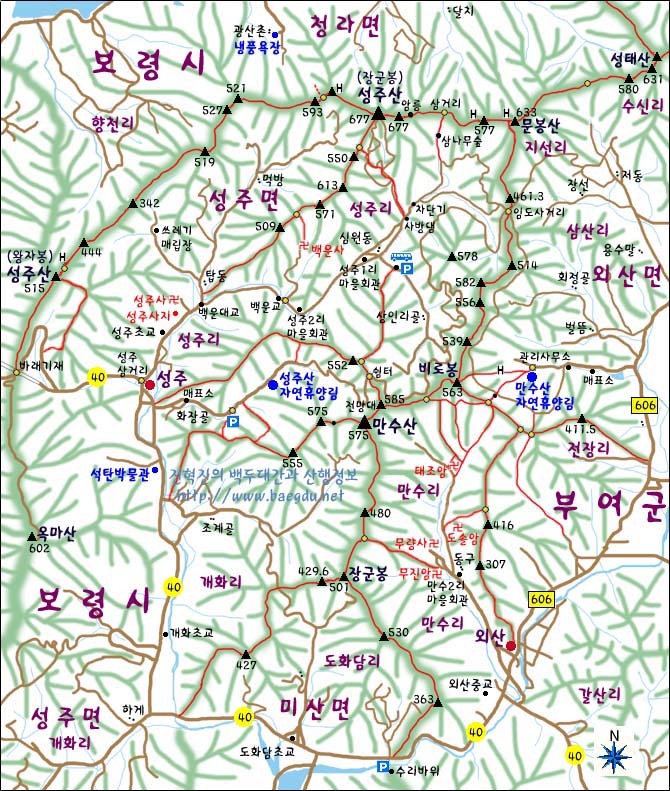 ↑ 산행 지도. 오늘 코스는 수리바위-363봉-530봉-장군봉-480봉-조루봉-전망대-585봉-비로봉-416봉-307봉-외산소재지-외산중학교-수리바위로 원점회귀