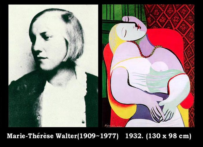 “마리 테레즈 월터의 외모는 놀라웠다. 그녀가 파블로(피카소)에게 조형적인 영감을 준 여자라는 걸 분명히 알 수 있다. 그녀의 얼굴은 고대 그리스 스타일로 아주 매력적이었고 볼륨과 선이 뚜렷한 그녀의 몸은 완벽했으며 한 점의 빼어난 조각 같았다. --- 그녀는 모델로서 아주 훌륭했다.”라고 프랑수아즈 질로는 <피카소의 나날들>이란 책에 썼다. 프랑수아즈 질로 역시 피카소의 또 다른 연인으로 케임브리지와 소르본 대학교에서 공부한 지성파 화가였다.