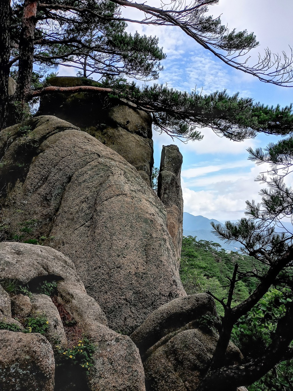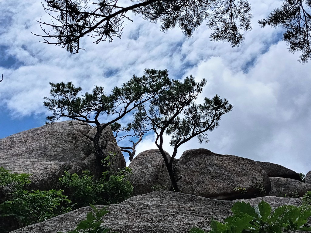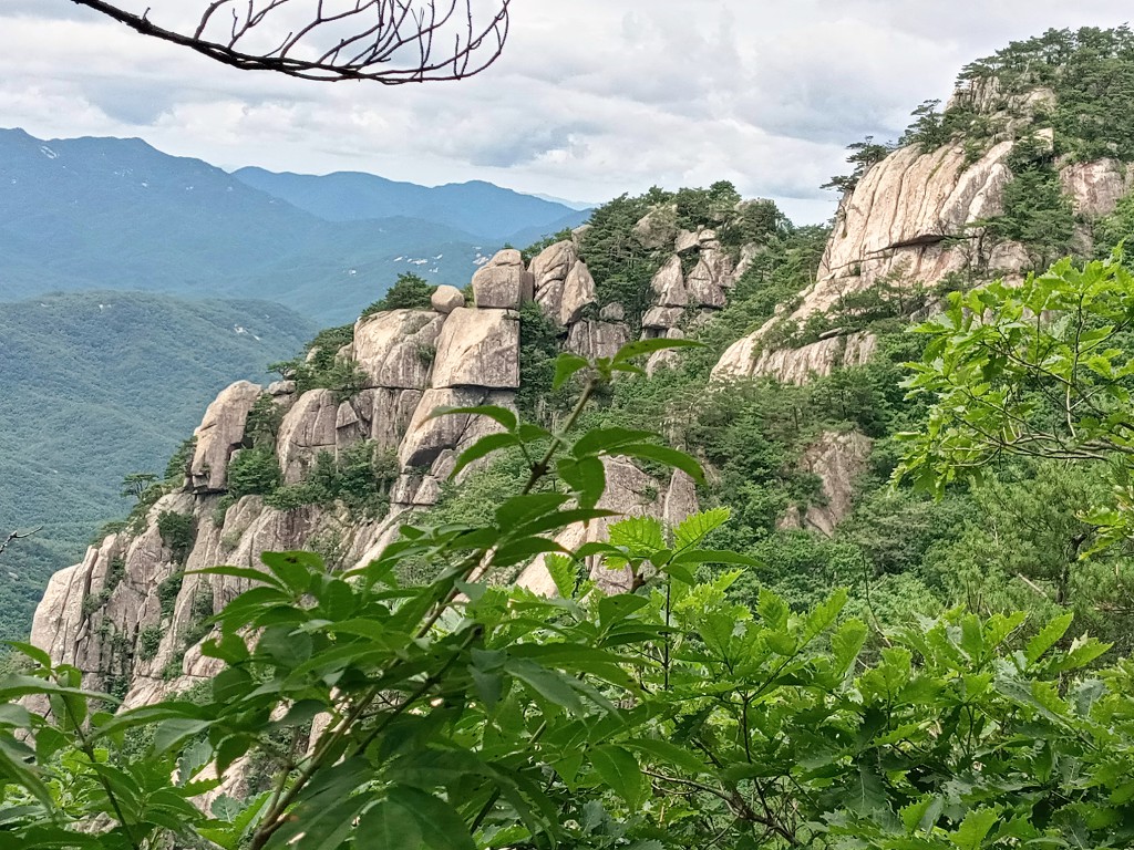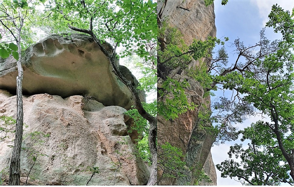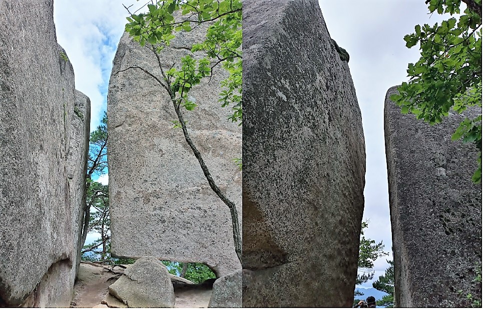 밀재를 향하는데 언제부턴가 매미도 합창단의 일원이 된 성싶었다. 매미울음이 간 들어지게 아련하다. 밀제에서부턴 약간 오르막이고 전초병바위가 간혹 숲에서 망을 보고 있었다. 놈은 파말을 어찌 띄었기에 바위병정들은 점점 떼를 형성하고 등치우람한 놈들이 나타날까? 때론우락부락한 놈들이 바람결에 아우성을 몰고와 길을 막기도 한다. 그 품새와 훼방이 멋지다. 대야산은 기기묘묘한 바위들의 그렇게 시위를 벌려 유명세를 탄 명산이다.