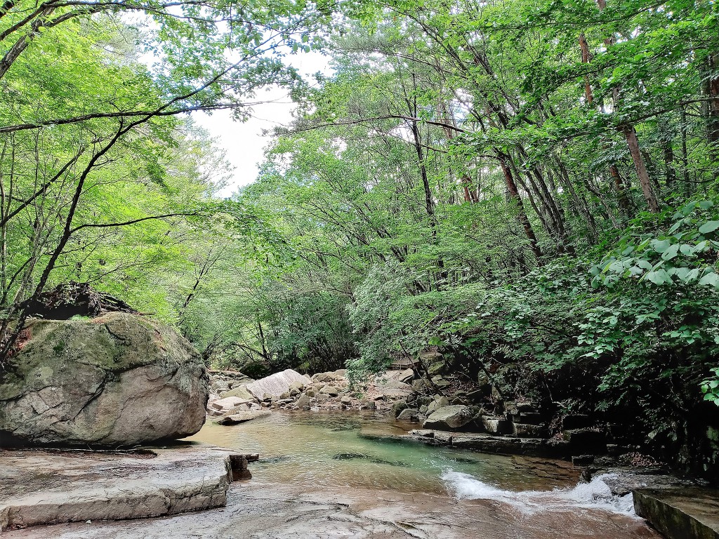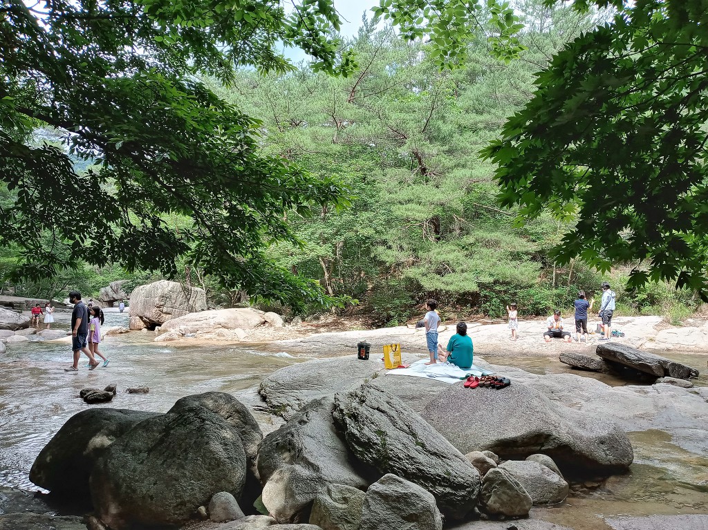 가이드라인 붙잡고 아쉬워하는 사람들이 빙 둘러서서 또 하트(♡)띠를 치고 있었다. 용추골짝 물길의 합창은 줄곧 이어진다. 촉촉이 젓은 숲길의 푸나무들이 반들반들한 이파리를 떨며 기지개를 펴면 물방울은 정처 없이 나무사이를 건너뛰는 텀블링을 한다. 그 놈이 얼굴에 스치기라도 해봐라. 얼마나 상큼하고 신비한지! 물은 생명의 원천이다. 음악의 원류도 물소리였지 싶다. 물이 바람을 낳고 바람은 소리의 파장을 실어 나른다.