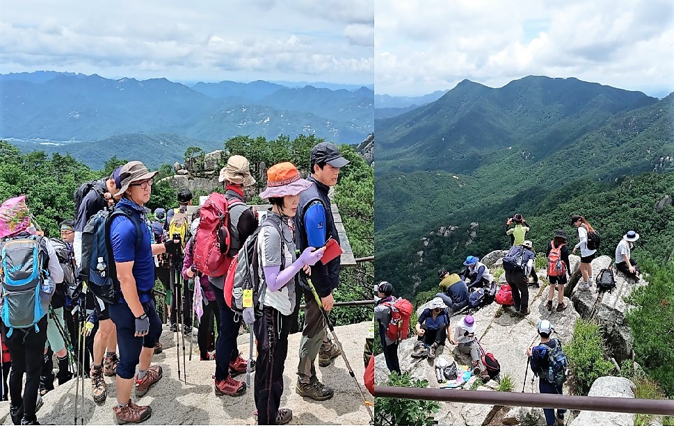 나를 오늘 대야산에 대려다 준 ‘한숲산악’에 우리나라명산 100번째 등정으로 대야산에 오르는 17명의 산우들이 동승했다. 그 산님들도 인증하려고 저렇게 꼬리를 이었을 테다. 참 대단한 산님들 - 당당한 산님들은 거의 여성이었다. 그 산우님들은 100산 등정기념으로 예쁜 손수건을 나한테도 선물해줘 기분 좋았다. 마스크 썼어도 산을 좋아하는 산우님들이라 예쁜 모습이 역력히 배어나왔다. 건강 챙기셔 즐산 이어가시기 축원했다.