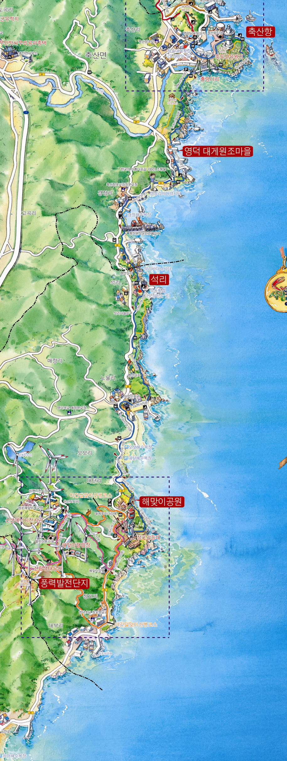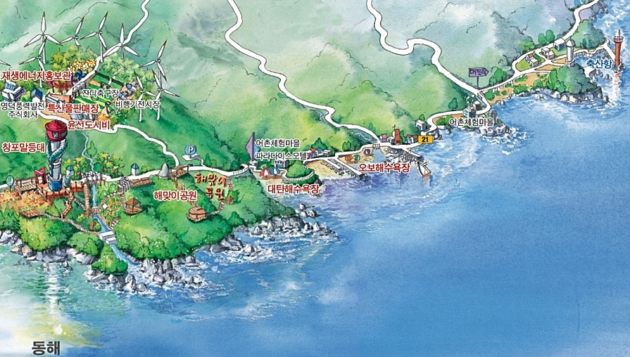 *트레킹 코스 : 해맞이공원(창포말등대) - 대탄항 해수욕장 - 오보해수욕장 - 노물리방파제 - 해녀상 - 군인상 - 석리어촌체험마을 - 경정3리 - 축산원석운반컨베이어 -경정해수욕장 -경정1리 마을회관 8km (3시간소요)