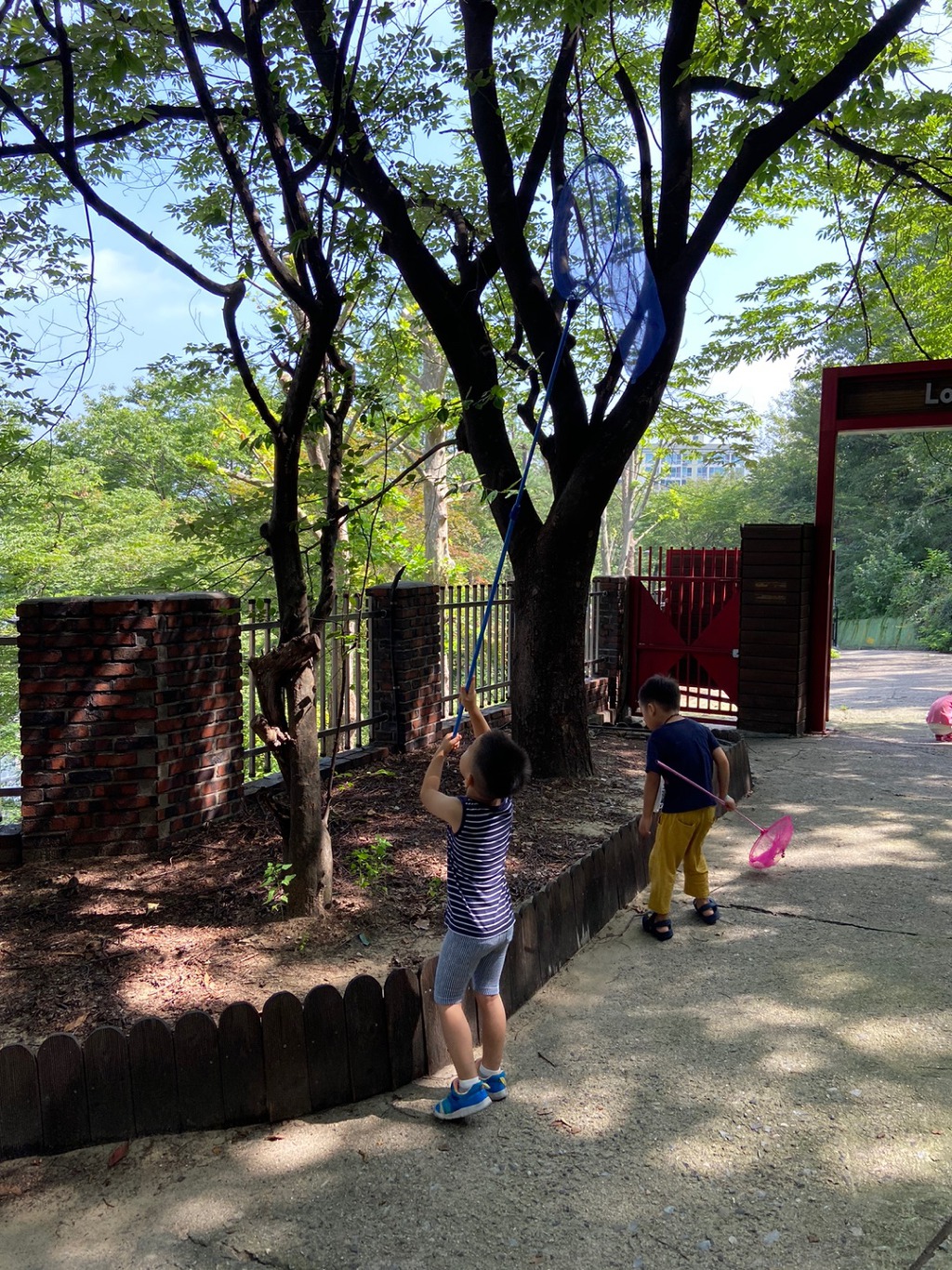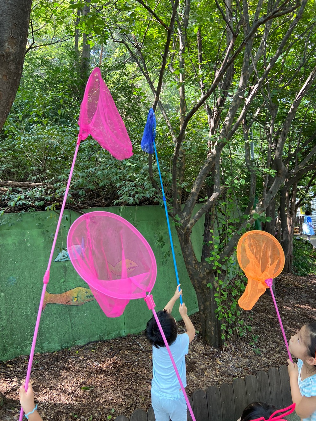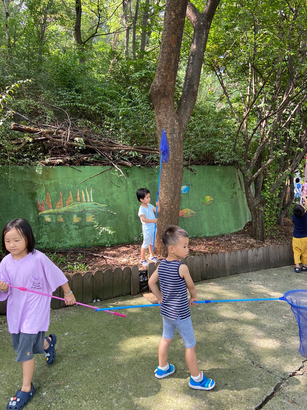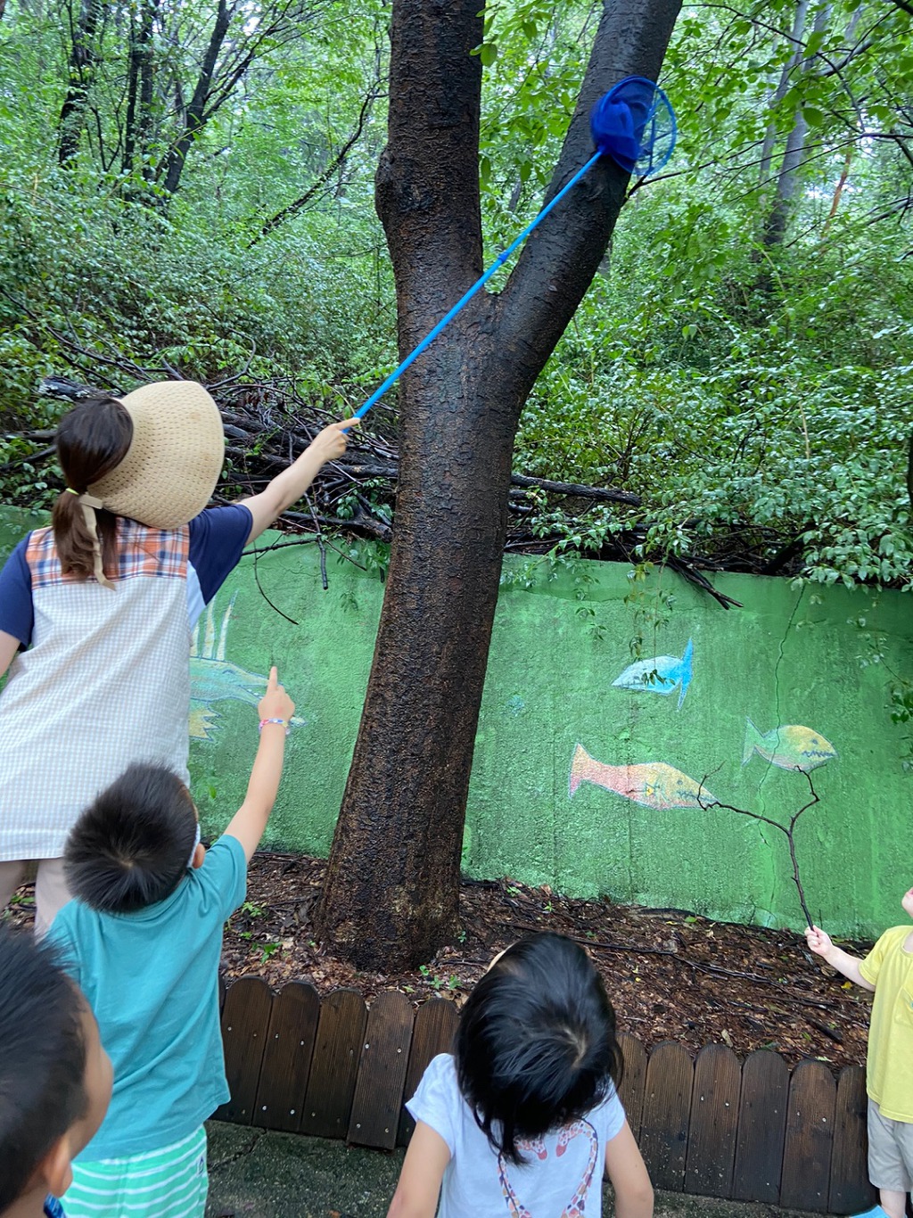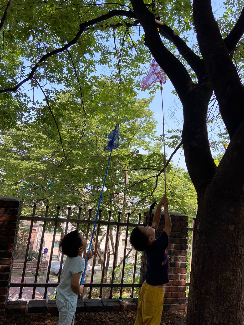 지금은 아이들이 나무에 있는 매미들도 찾고 매미채를 높이 뻗어 스스로 잡아보려고 노력하는 모습이에요