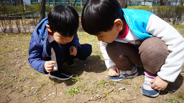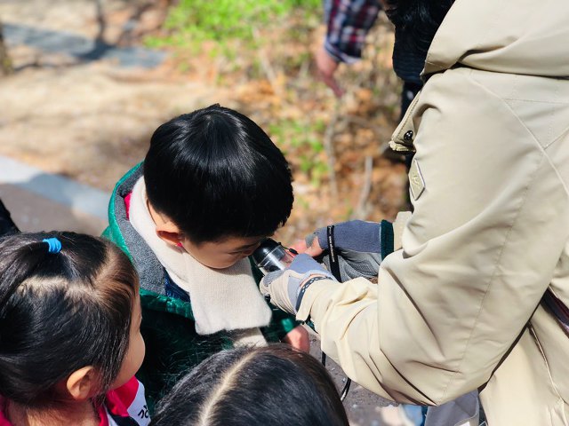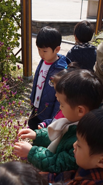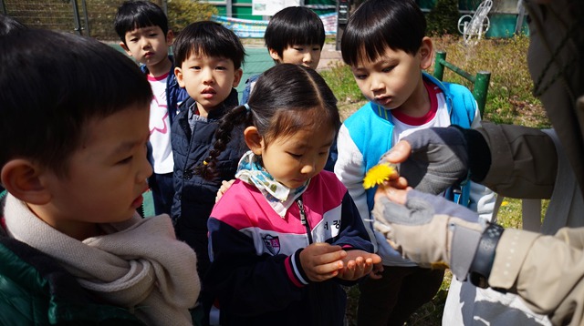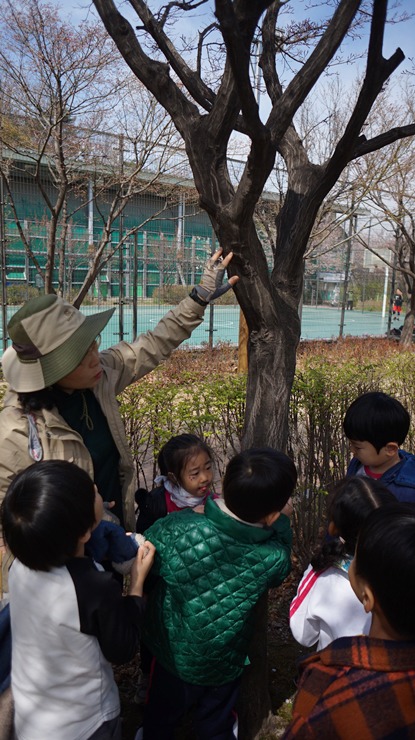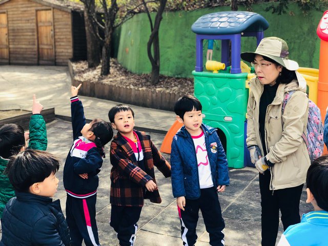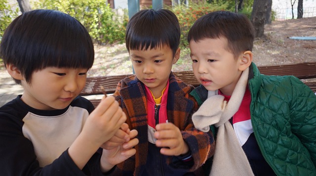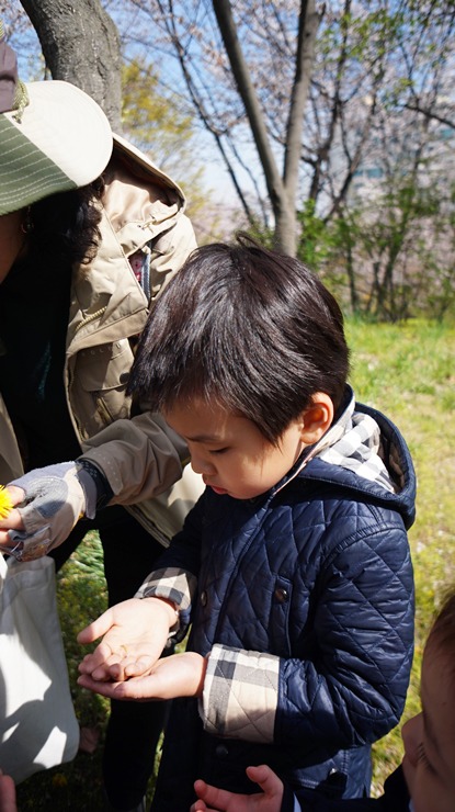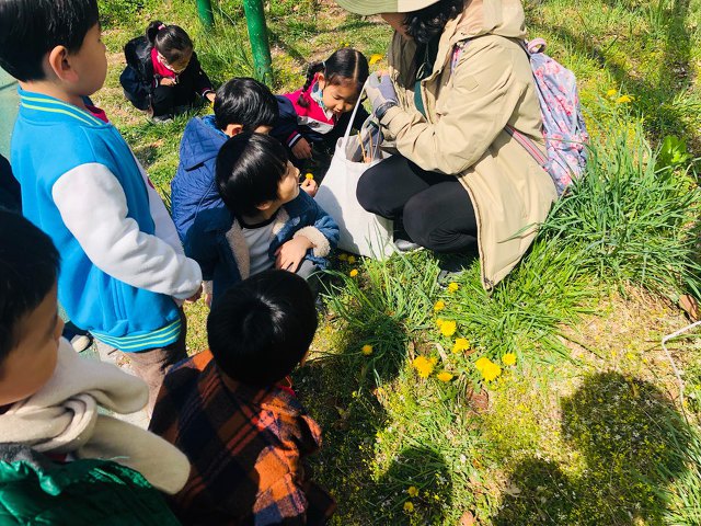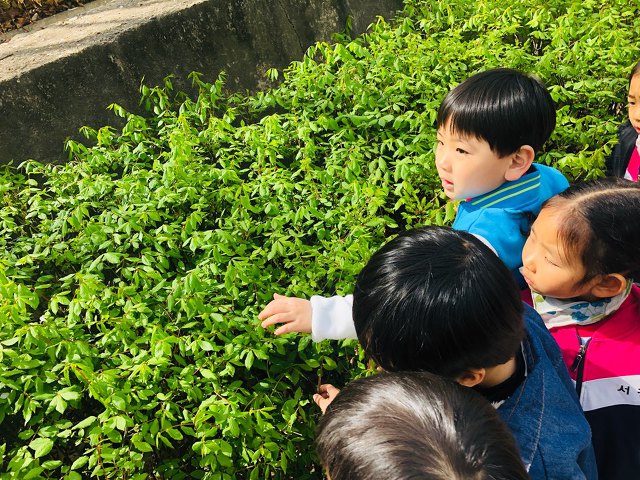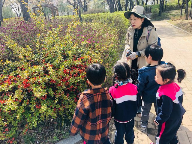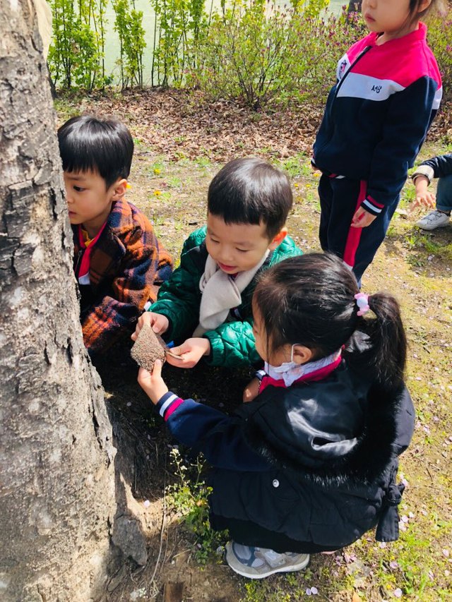 따뜻한 바람이 솔솔 부는 오늘! 열매반 친구들은 도토리 선생님을 만났어요~ 열매반이 되어 만나는 도토리 선생님은 더욱 반가웠지요 친구들이 모두 밖으로 나온 뒤 도토리 선생님과 인사를 나누었어요 선생님 안녕하세요! 도토리 선생님도 반갑게 친구들을 맞이해 주셨지요 따뜻해진 날씨에 대해 도토리 선생님과 이야기를 나누며 따뜻한 햇살이 비추어 주는 햇님이 어디있는지 찾아보았어요! 우리의 얼굴을 반짝 비추어 주는 햇님은 어디있나? 우리의 손을 반짝 비추어 주는 햇님은 어디있나? 따뜻한 햇살을 맞으며 와우산으로 출발하였어요 어? 둥지다! 가는길 열매반 친구들이 나무 위에 둥지를 발견하였어요 저 둥지는 누구의 둥지일까? "참새 둥지 아닐까요?" 열매반 친구들이 추측해 보았어요. 저 둥지는 더 몸집이 큰 새의 둥지래요 참새보다 더 몸집이 큰 새? 비둘기? 까마귀? 독수리??!! 바로바로 까치의 둥지래요~^^ "꽃이 많이 피었어요~!" 팝콘처럼 핀 벚꽃에 열매반 친구들은 큰 관심을 보였어요 오늘 도토리 선생님께서는 곤충 친구들 이야기를 준비해주셨는데 친구들이 꽃에 흥미를 보여 꽃 이야기도 많이 해주셨답니다^^ 예쁜 벚꽃이 피는 벚나무를 좋아하는 곤충이 있데요. 어떤 곤충일까요? 열매반 친구들은 알고 있는 곤충을 이야기해보았어요 매미? 나비? 여러 곤충들이 벚나무를 좋아하지만 가장 좋아하는 곤충은 바로 개미래요! 벚나무 나뭇잎에는 꿀샘이 있는데 꿀샘에서 나오는 꿀을 개미가 좋아한데요. 또 개미는 벚나무에게 오는 나쁜 곤충을 막아주는 역할도 하는 고마운 친구래요~ 도토리 선생님께서 벚나무의 나뭇잎에 있는 꿀샘을 찾아 친구들에게 보여주셨어요 잎사귀에 뽈록뽈록 튀어 나와 있었답니다. 어? 이건 뭐에요? 친구들이 벚나무 옆 나무에 관심을 보였어요 이 나무의 잎은 나물로 해 먹을 수도 있데요. 그리고 가지는 화살처럼 생겨서 화살나무라고 불린데요. 우와~! 민들레가 엄청 많이 있어요!! 이번에는 샛노란색의 민들레가 친구들의 시선을 사로 잡았어요 민들레 한 송이는 한송가 아니래요. 200송이가 넘는 꽃이 모아져 있는 거에요. 도토리 선생님은 다발로 묶어 있는 민들레에서 꽃 한송이를 때어 보여주셨어요 이것이 민들레 하나랍니다. 이 빨간 꽃은 뭐에요?? 이 나무는 명자 나무인데 함부로 만지면 안된데요 바로 가지에 가시가 있기 때문이에요! 명자 나무에서는 모과보다 작은 열매가 열리는데 겨울이 되면 새들이 이 열매 먹는 것을 좋아한데요. 와우산의 커다란 나무는 겨울 동안 곤충들이 지낼 수 있는 공간이 되어요 나무 껍질을 열면 겨울 동안 숨어있던 곤충을 만날 수 있데요! 곤충이 어디있을까~? 친구들을 나무 껍질을 열어 찾아보았어요. 주로 무당벌레, 노린재, 거미를 만날 수 있데요 우리 친구들은 어떤 친구를 찾았을까요?? 열매반 친구들은 거미를 찾았어요! 연두색 거미, 검정색 거미를 찾았지요~ 거미는 곤충이 아니에요. 다리가 여덟개이고 날개가 없어요 더듬이는 있지요. 거미는 절지 동물이라고 한데요. 나무에 붙어 있는 알도 찾았어요! 이 알은 노린재의 알인데 엄마 노린재는 알을 딱 14개 낳는데요. 알들이 서로 다닥다닥 붙어 있지요? 왜 알들이 서로 붙어 있을까요? "같이 깨어나려고?/잃어버리지 않으려고?" 그 이유는 뭉쳐있으면 다른 곤충들이 봤을때 커보여서 뭉쳐있는거래요 이 꽃은 끈적끈적해요! 끈적끈적한 곳에 곤충들이 잘 붙어요. 열매반 친구들은 풀잠자리가 붙어있는 것을 발견했어요 그리고 꽃을 잘 보면 점이 있는데 이 점을 꿀길이라고 한데요. 꿀나비가 이 을 보고 꽃을 찾아와요. 도토리 선생님께서 평소에 보기 어려운 사마귀알집을 준비해 주셔서 관찰해보았어요~ 좀사마귀알집, 넙적배사마귀 알집, 왕사마귀 알집의 모양과 느낌이 모두 달라서 신기했어요 와우산의 많은 이야기를 들려주신 도토리 선생님께 감사합니다 인사하고 열매반 친구들은 좀 더 와우공원에서 놀이하였어요 민들레를 다시 탐색하기도 하고 바닥에 떨어진 벚꽃잎을 만져보기도 하고 봄이 되어 바쁜 개미들의 모습도 살폈어요 와우산에 숨어 있던 이야기를 들은 후여서 더욱 와우산의 자연물에 호기심을 가지고 탐색하는 모습이었답니다^^ |