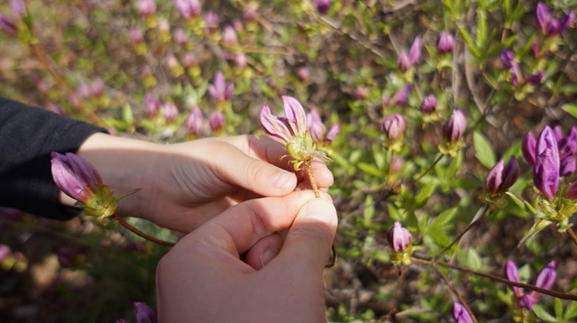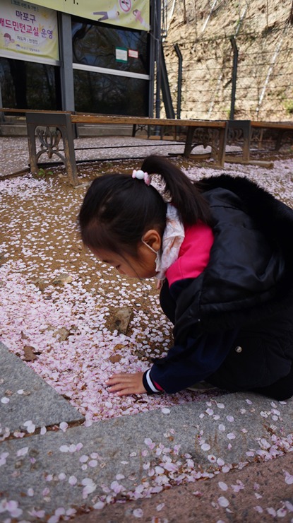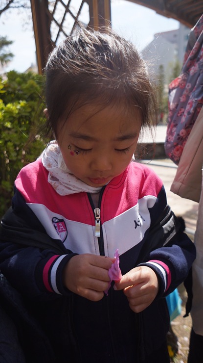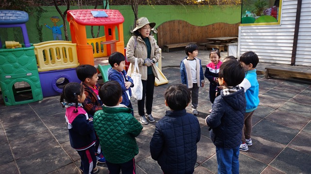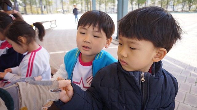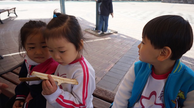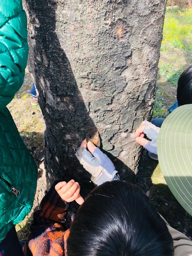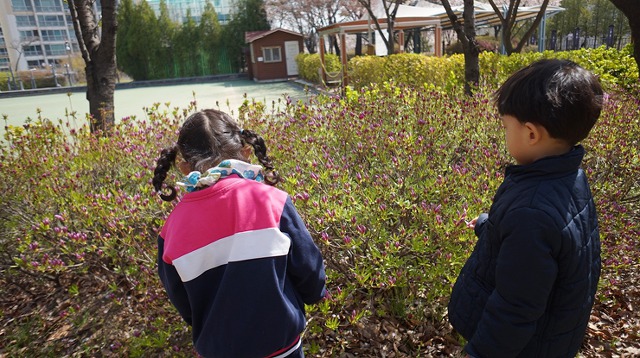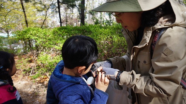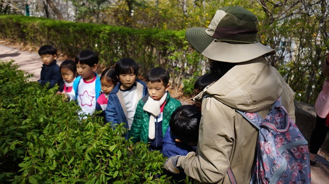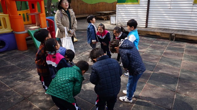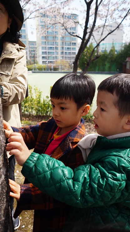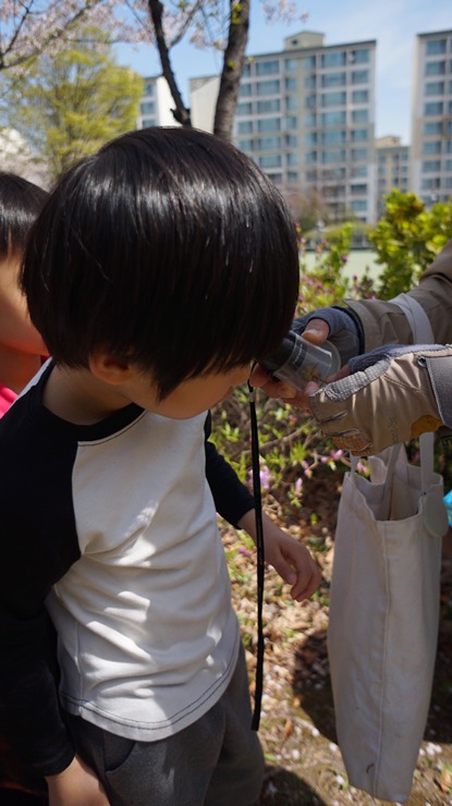 따뜻한 바람이 솔솔 부는 오늘! 열매반 친구들은 도토리 선생님을 만났어요~ 열매반이 되어 만나는 도토리 선생님은 더욱 반가웠지요 친구들이 모두 밖으로 나온 뒤 도토리 선생님과 인사를 나누었어요 선생님 안녕하세요! 도토리 선생님도 반갑게 친구들을 맞이해 주셨지요 따뜻해진 날씨에 대해 도토리 선생님과 이야기를 나누며 따뜻한 햇살이 비추어 주는 햇님이 어디있는지 찾아보았어요! 우리의 얼굴을 반짝 비추어 주는 햇님은 어디있나? 우리의 손을 반짝 비추어 주는 햇님은 어디있나? 따뜻한 햇살을 맞으며 와우산으로 출발하였어요 어? 둥지다! 가는길 열매반 친구들이 나무 위에 둥지를 발견하였어요 저 둥지는 누구의 둥지일까? "참새 둥지 아닐까요?" 열매반 친구들이 추측해 보았어요. 저 둥지는 더 몸집이 큰 새의 둥지래요 참새보다 더 몸집이 큰 새? 비둘기? 까마귀? 독수리??!! 바로바로 까치의 둥지래요~^^ "꽃이 많이 피었어요~!" 팝콘처럼 핀 벚꽃에 열매반 친구들은 큰 관심을 보였어요 오늘 도토리 선생님께서는 곤충 친구들 이야기를 준비해주셨는데 친구들이 꽃에 흥미를 보여 꽃 이야기도 많이 해주셨답니다^^ 예쁜 벚꽃이 피는 벚나무를 좋아하는 곤충이 있데요. 어떤 곤충일까요? 열매반 친구들은 알고 있는 곤충을 이야기해보았어요 매미? 나비? 여러 곤충들이 벚나무를 좋아하지만 가장 좋아하는 곤충은 바로 개미래요! 벚나무 나뭇잎에는 꿀샘이 있는데 꿀샘에서 나오는 꿀을 개미가 좋아한데요. 또 개미는 벚나무에게 오는 나쁜 곤충을 막아주는 역할도 하는 고마운 친구래요~ 도토리 선생님께서 벚나무의 나뭇잎에 있는 꿀샘을 찾아 친구들에게 보여주셨어요 잎사귀에 뽈록뽈록 튀어 나와 있었답니다. 어? 이건 뭐에요? 친구들이 벚나무 옆 나무에 관심을 보였어요 이 나무의 잎은 나물로 해 먹을 수도 있데요. 그리고 가지는 화살처럼 생겨서 화살나무라고 불린데요. 우와~! 민들레가 엄청 많이 있어요!! 이번에는 샛노란색의 민들레가 친구들의 시선을 사로 잡았어요 민들레 한 송이는 한송가 아니래요. 200송이가 넘는 꽃이 모아져 있는 거에요. 도토리 선생님은 다발로 묶어 있는 민들레에서 꽃 한송이를 때어 보여주셨어요 이것이 민들레 하나랍니다. 이 빨간 꽃은 뭐에요?? 이 나무는 명자 나무인데 함부로 만지면 안된데요 바로 가지에 가시가 있기 때문이에요! 명자 나무에서는 모과보다 작은 열매가 열리는데 겨울이 되면 새들이 이 열매 먹는 것을 좋아한데요. 와우산의 커다란 나무는 겨울 동안 곤충들이 지낼 수 있는 공간이 되어요 나무 껍질을 열면 겨울 동안 숨어있던 곤충을 만날 수 있데요! 곤충이 어디있을까~? 친구들을 나무 껍질을 열어 찾아보았어요. 주로 무당벌레, 노린재, 거미를 만날 수 있데요 우리 친구들은 어떤 친구를 찾았을까요?? 열매반 친구들은 거미를 찾았어요! 연두색 거미, 검정색 거미를 찾았지요~ 거미는 곤충이 아니에요. 다리가 여덟개이고 날개가 없어요 더듬이는 있지요. 거미는 절지 동물이라고 한데요. 나무에 붙어 있는 알도 찾았어요! 이 알은 노린재의 알인데 엄마 노린재는 알을 딱 14개 낳는데요. 알들이 서로 다닥다닥 붙어 있지요? 왜 알들이 서로 붙어 있을까요? "같이 깨어나려고?/잃어버리지 않으려고?" 그 이유는 뭉쳐있으면 다른 곤충들이 봤을때 커보여서 뭉쳐있는거래요 이 꽃은 끈적끈적해요! 끈적끈적한 곳에 곤충들이 잘 붙어요. 열매반 친구들은 풀잠자리가 붙어있는 것을 발견했어요 그리고 꽃을 잘 보면 점이 있는데 이 점을 꿀길이라고 한데요. 꿀나비가 이 을 보고 꽃을 찾아와요. 도토리 선생님께서 평소에 보기 어려운 사마귀알집을 준비해 주셔서 관찰해보았어요~ 좀사마귀알집, 넙적배사마귀 알집, 왕사마귀 알집의 모양과 느낌이 모두 달라서 신기했어요 와우산의 많은 이야기를 들려주신 도토리 선생님께 감사합니다 인사하고 열매반 친구들은 좀 더 와우공원에서 놀이하였어요 민들레를 다시 탐색하기도 하고 바닥에 떨어진 벚꽃잎을 만져보기도 하고 봄이 되어 바쁜 개미들의 모습도 살폈어요 와우산에 숨어 있던 이야기를 들은 후여서 더욱 와우산의 자연물에 호기심을 가지고 탐색하는 모습이었답니다^^ |