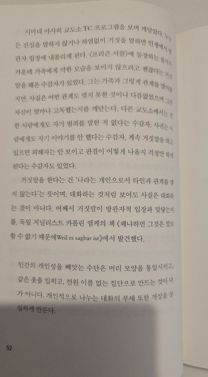 "거짓말을 한다는 건 나라는 개인으로서 타인과의 관계를 맺지 않는다는 뜻이며, 대화하는것 처럼 보여도 사실은 대화하는것이 아니다"