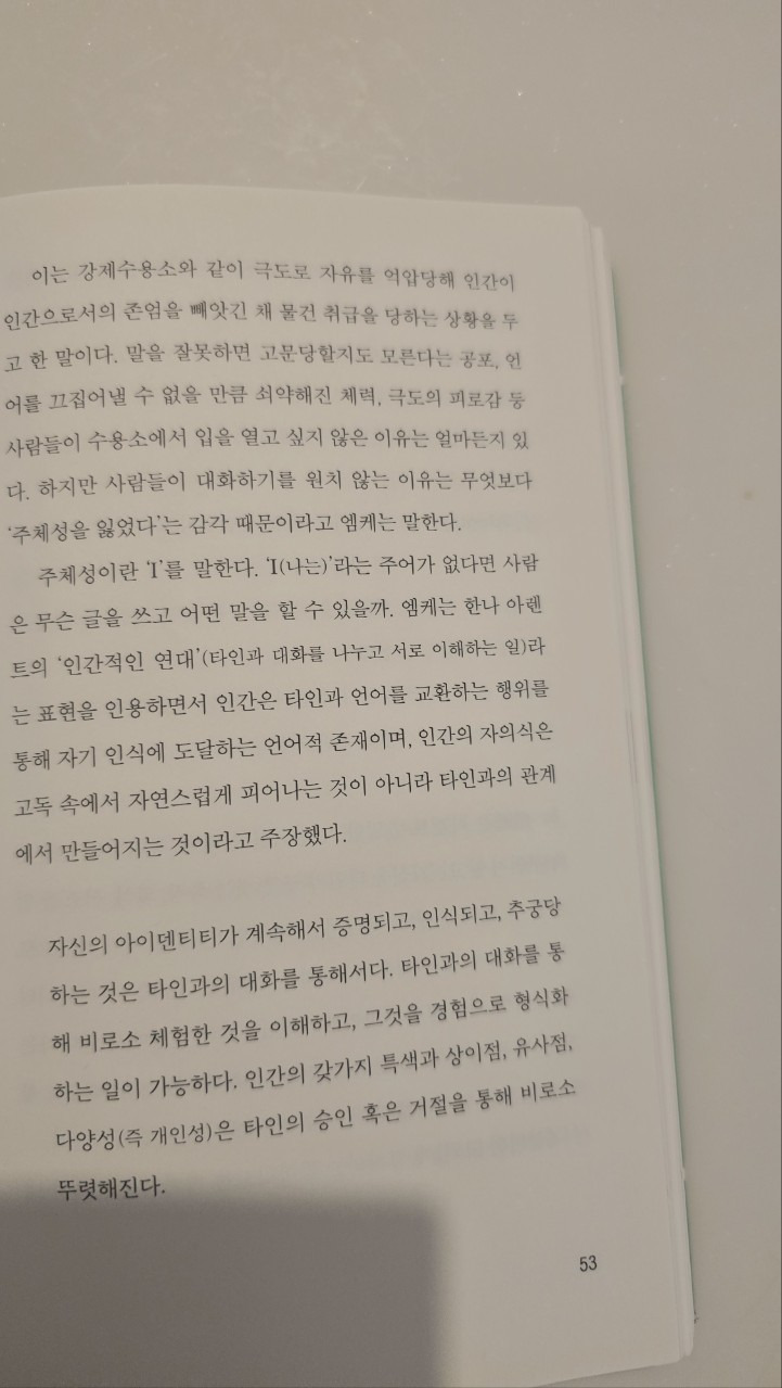 "자신의 아이덴티티가 계속해서 증명되고, 인식되고, 추궁당하는 것은 타인과의 대화를 통해서다. 타인과의 대화를 통해 비로소 체험한 것을 이해하고 그것을 경험으로 형식화 하는 일이 가능하다. 인간의 갖가지 특색과 상이점, 유사점, 다양성은 타인의 승인 혹은 거절을 통해 비로소 뚜렷해 진다."