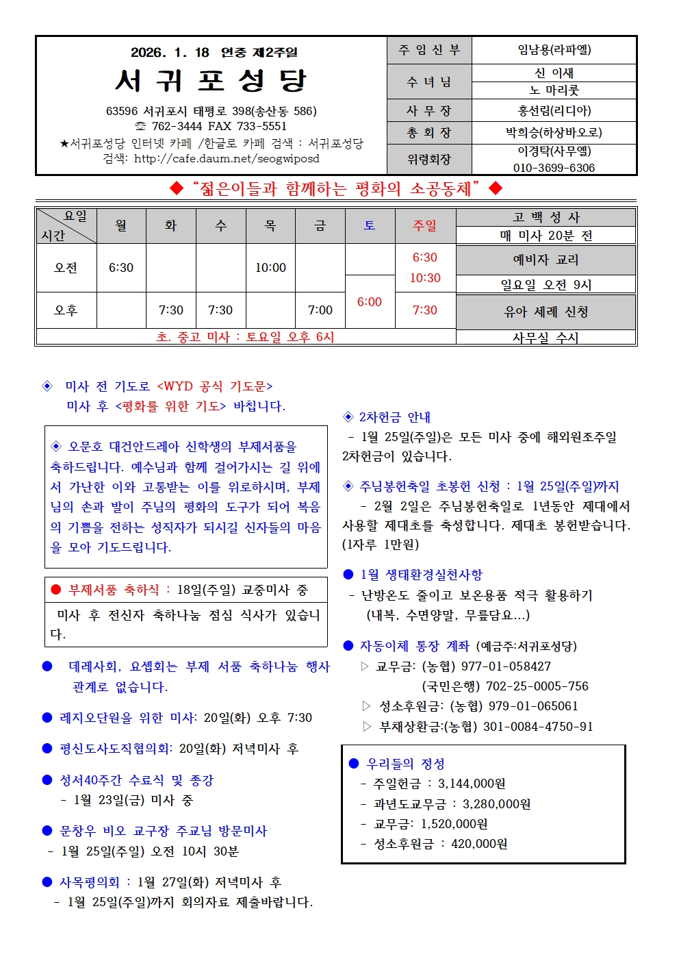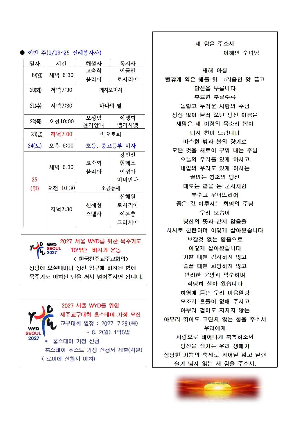 연중 제2주일(2026. 1. 18.) 본당 소식지 작성자프란치스코|작성시간26.01.17|조회수255 목록 댓글 0 글자크기 작게가 글자크기 크게가 다음검색 현재 게시글 추가 기능 열기 북마크 공유하기 신고 센터로 신고 댓글 댓글 0 댓글쓰기 답글쓰기 댓글 리스트