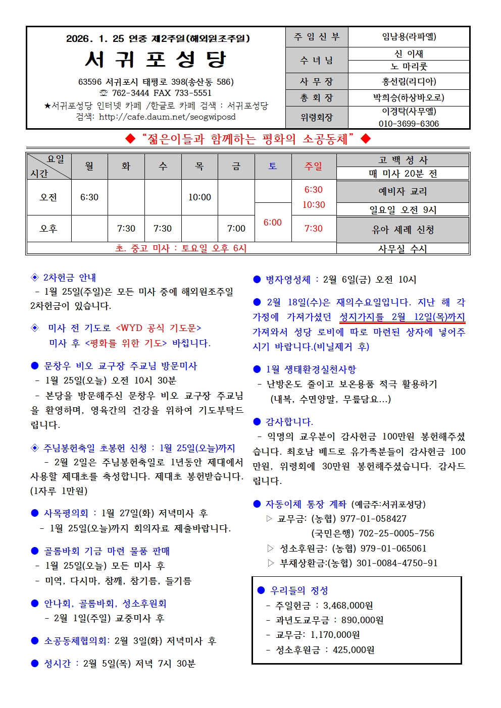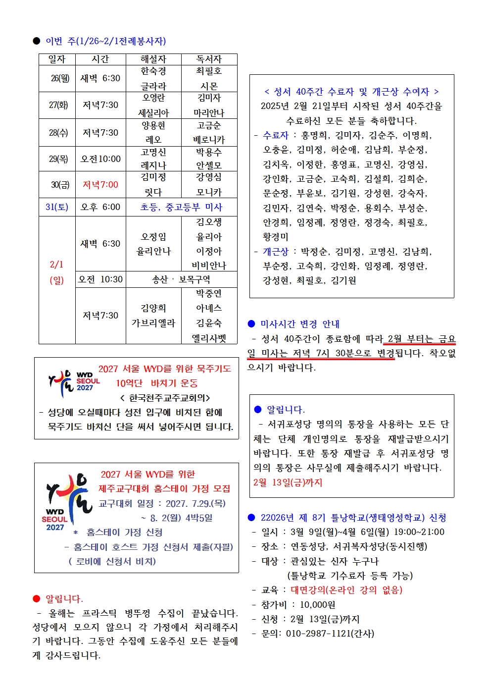 연중 제3주일/해외 원조 주일(2026. 1. 25.) 본당 소식지 작성자프란치스코|작성시간26.01.24|조회수179 목록 댓글 0 글자크기 작게가 글자크기 크게가 다음검색 현재 게시글 추가 기능 열기 북마크 공유하기 신고 센터로 신고 댓글 댓글 0 댓글쓰기 답글쓰기 댓글 리스트