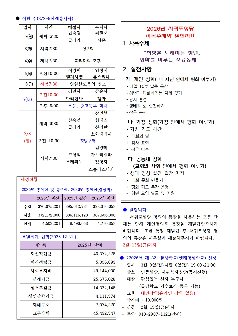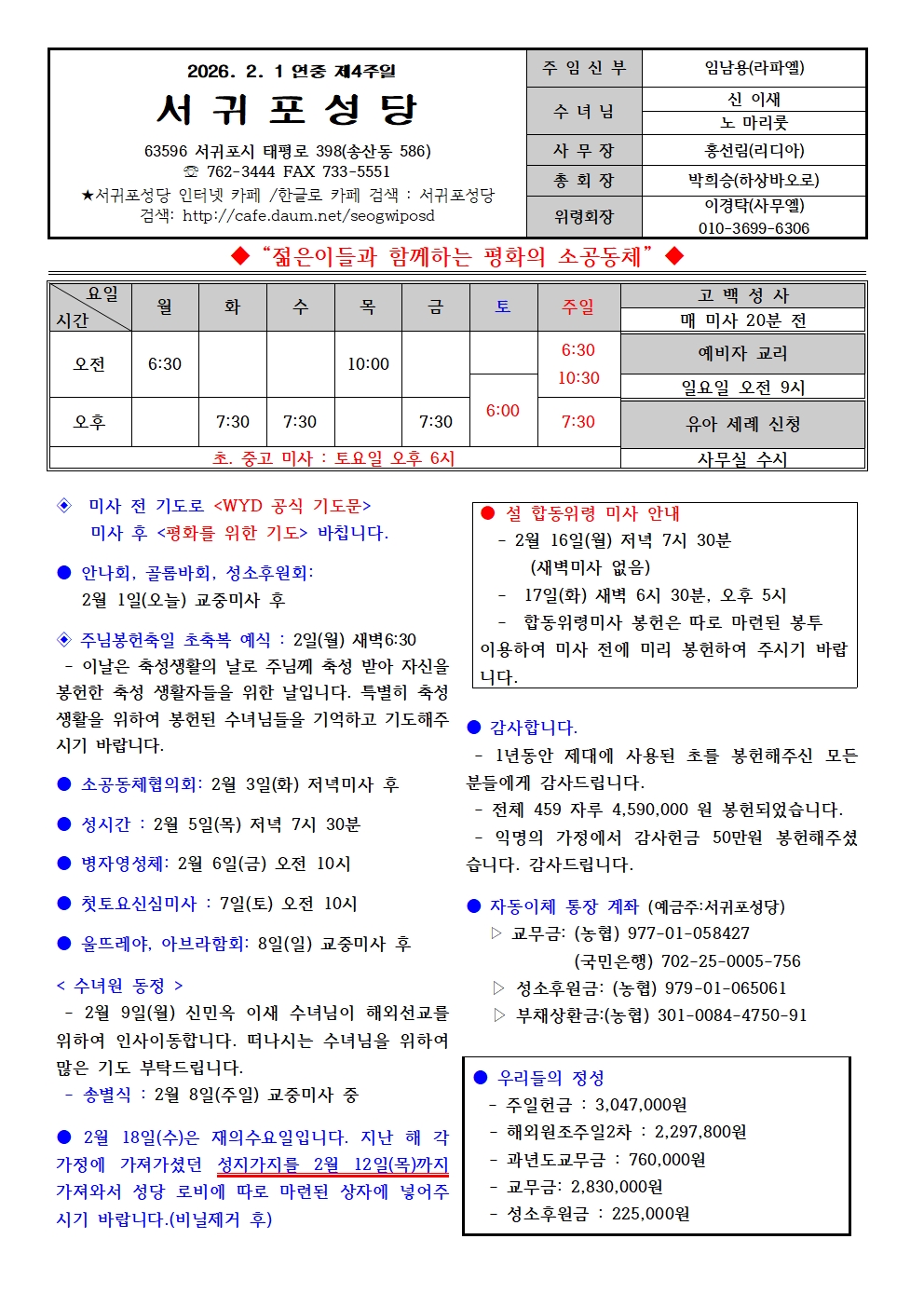 연중 제4주일(2026. 2. 1.) 본당 소식지 작성자프란치스코|작성시간26.01.31|조회수207 목록 댓글 0 글자크기 작게가 글자크기 크게가 다음검색 현재 게시글 추가 기능 열기 북마크 공유하기 신고 센터로 신고 댓글 댓글 0 댓글쓰기 답글쓰기 댓글 리스트