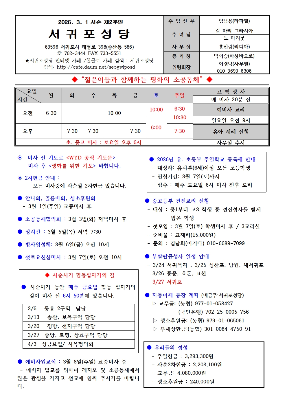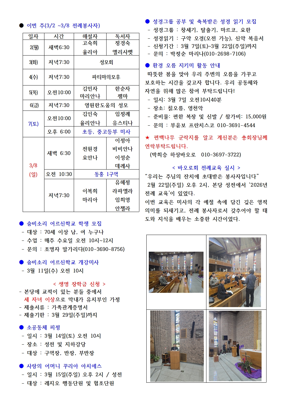 사순 재2주일(2026. 3. 1.) 본당 소식지 작성자프란치스코|작성시간26.02.28|조회수194 목록 댓글 0 글자크기 작게가 글자크기 크게가 다음검색 현재 게시글 추가 기능 열기 북마크 공유하기 신고 센터로 신고 댓글 댓글 0 댓글쓰기 답글쓰기 댓글 리스트