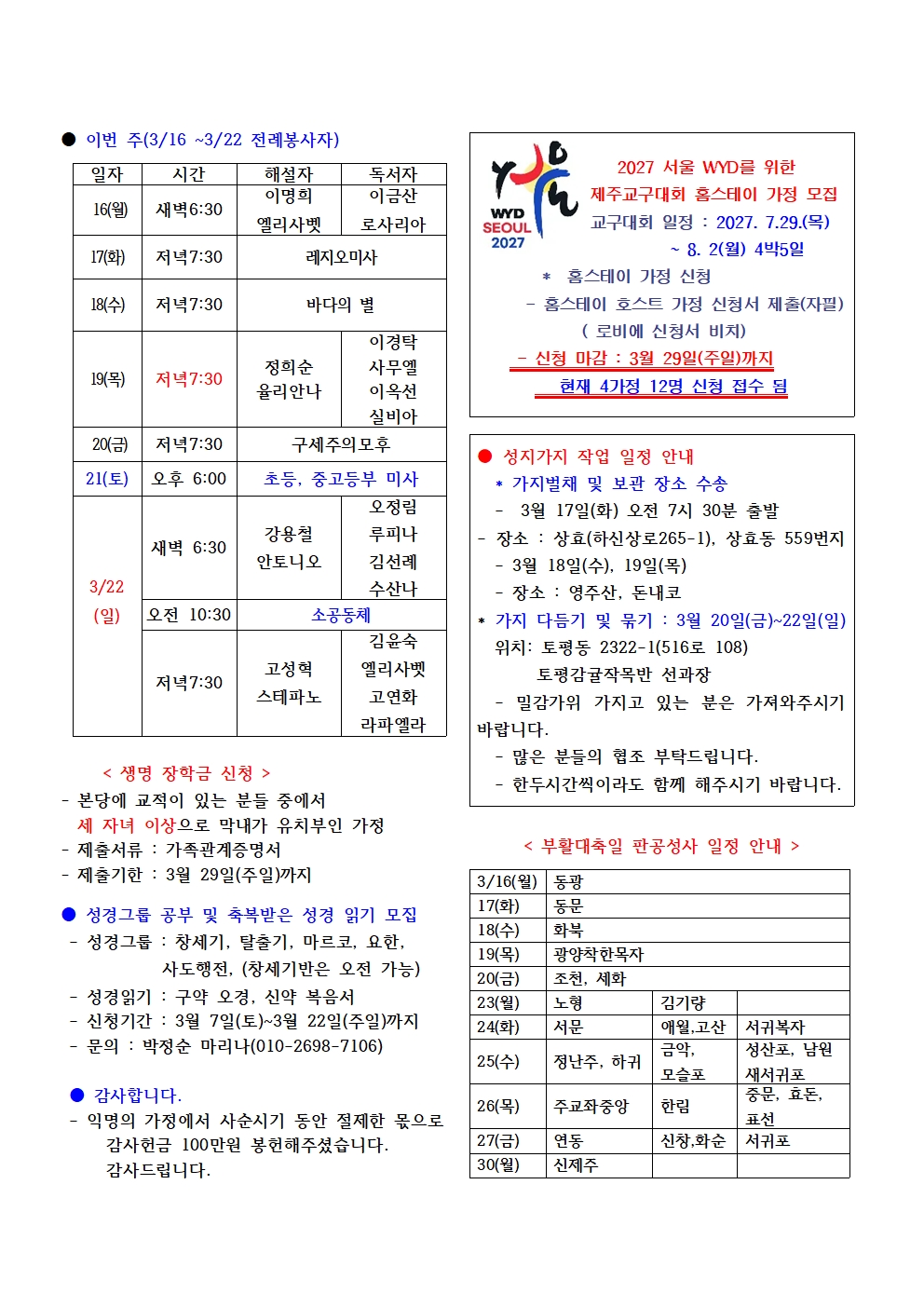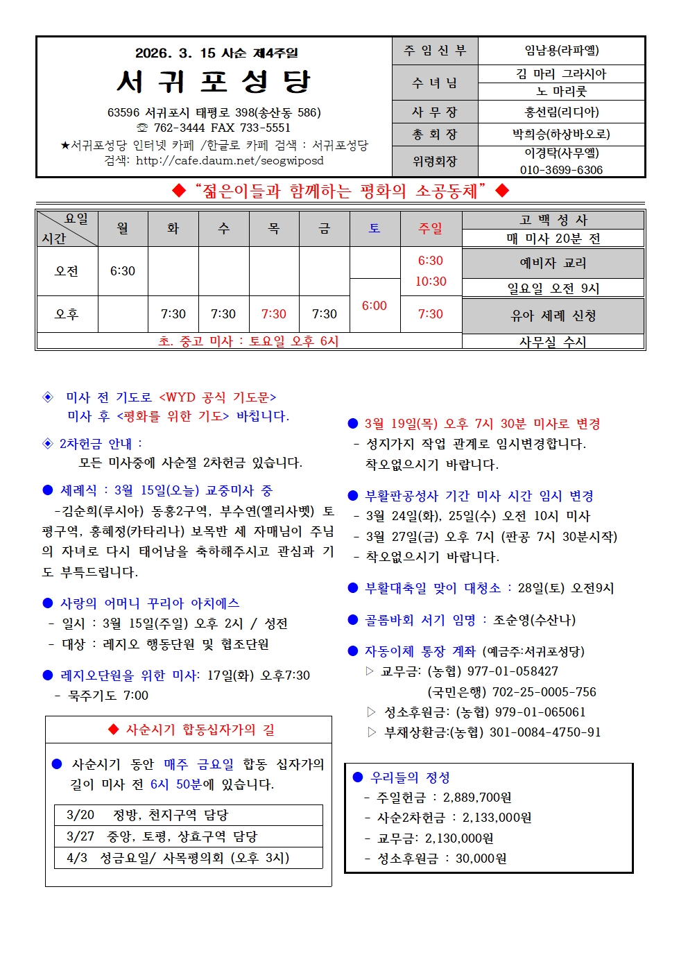 사순 제4주일(2026. 3. 15.) 본당 소식지 작성자프란치스코|작성시간26.03.14|조회수239 목록 댓글 0 글자크기 작게가 글자크기 크게가 다음검색 현재 게시글 추가 기능 열기 북마크 공유하기 신고 센터로 신고 댓글 댓글 0 댓글쓰기 답글쓰기 댓글 리스트