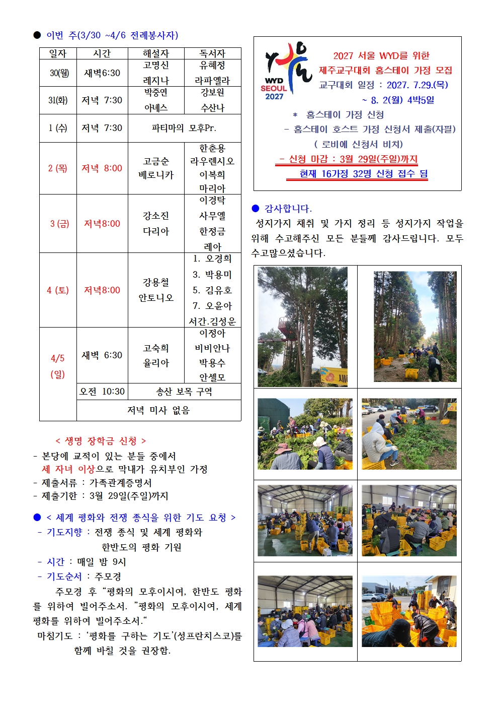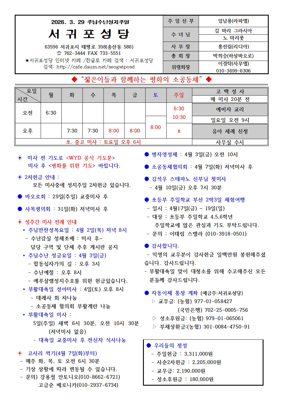 주님 수난 성지주일(2026. 3. 26) 본당 소식지 작성자프란치스코|작성시간26.03.28|조회수174 목록 댓글 0 글자크기 작게가 글자크기 크게가 다음검색 현재 게시글 추가 기능 열기 북마크 공유하기 신고 센터로 신고 댓글 댓글 0 댓글쓰기 답글쓰기 댓글 리스트