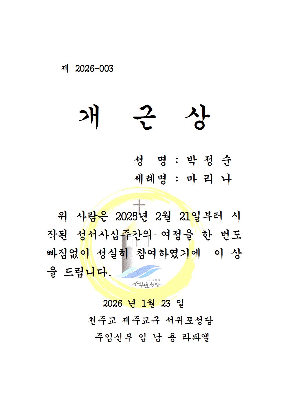 지난 2025년 2월 21일부터 시작된 성서사십주간을 마치며, 2026년 1월23일(금) 저녁미사 중 수료식을 진행하였다.