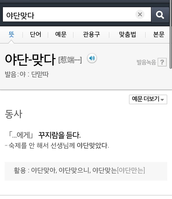 '야단맞다'가 사전에 올라와 있어요. 작성자초긍정|작성시간15.03.13|조회수154 목록 댓글 0 글자크기 작게가 글자크기 크게가 이렇게 되면 틀렸던 언어예절이이젠 맞는 언어예절이 되는 건가요? 다음검색 현재 게시글 추가 기능 열기 북마크 공유하기 신고 센터로 신고 댓글 댓글 0 댓글쓰기 답글쓰기 댓글 리스트