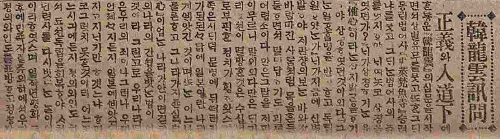 "자유는 만유의 생명이요, 평화는 인생의 행복이다. 그러므로 자유가 없는 사람은 사해(死骸·송장)와 같고 평화가 없는 자는 다시없는 고통이다. 압박을 받는 자의 주위는 무덤과 다름없고 쟁분(爭奮)을 일삼는 자의 환경은 지옥이 되나니 우주의 이상적 가장 행복한 실재(實在)는 자유와 평화다. 그렇기에 자유를 얻기 위해서는 생명을 홍모(鴻毛)처럼 가볍게 여기고 평화를 보전하기 위해서는 희생을 감태(甘飴)처럼 맛보나 이는 인생의 권리인 동시에 또한 의무일지로다."