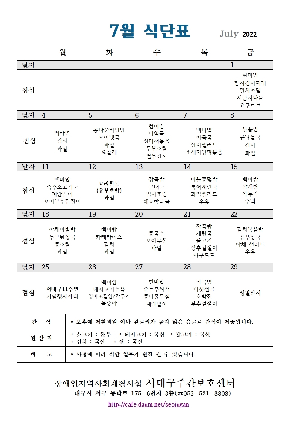 2022년 7월 식단표 작성자동글|작성시간22.06.30|조회수27 목록 댓글 0 글자크기 작게가 글자크기 크게가 다음검색 현재 게시글 추가 기능 열기 북마크 공유하기 신고 센터로 신고 댓글 댓글 0 댓글쓰기 답글쓰기 댓글 리스트