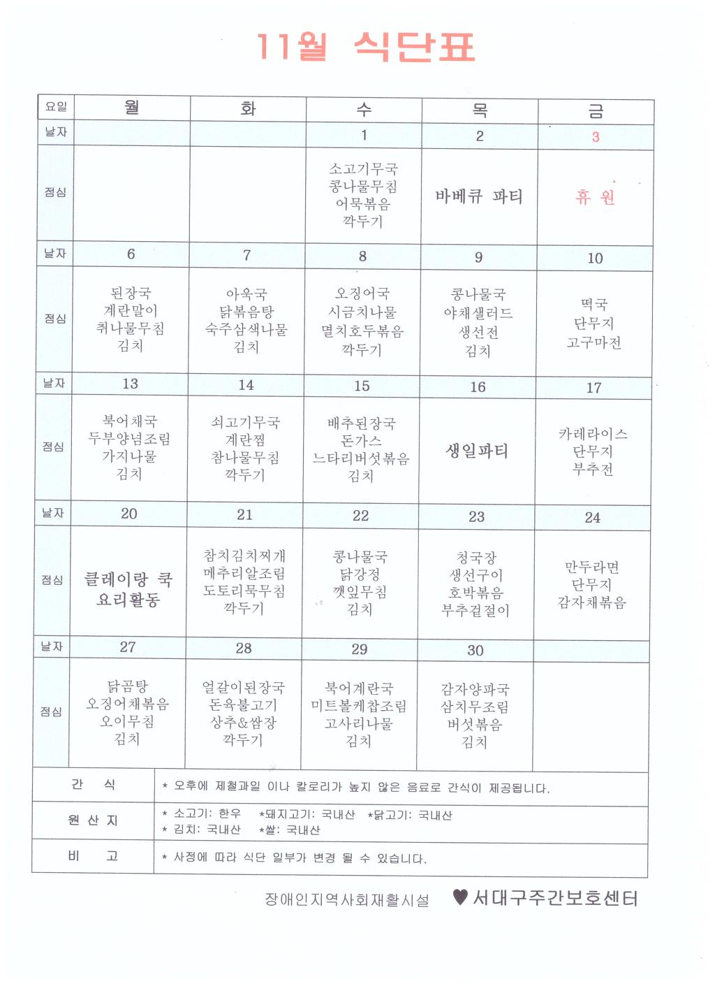 2017년 11월 식단표 작성자동글|작성시간17.10.31|조회수32 목록 댓글 0 글자크기 작게가 글자크기 크게가 다음검색 현재 게시글 추가 기능 열기 북마크 공유하기 신고 센터로 신고 댓글 댓글 0 댓글쓰기 답글쓰기 댓글 리스트