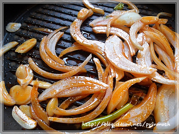 달구어진 팬에 만들어둔 고추기름을 두스픈 넣고 양파 부터 볶아 주셔요~~