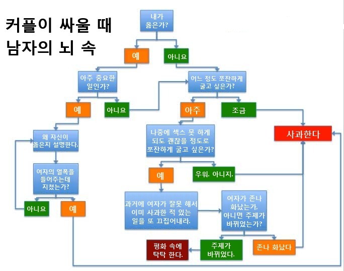 커플이 싸울때 남자의 뇌속 작성자토토|작성시간11.08.17|조회수271 목록 댓글 2 글자크기 작게가 글자크기 크게가 이미지 출처 : 인터넷 다음검색 현재 게시글 추가 기능 열기 북마크 공유하기 신고 센터로 신고 댓글 댓글 2 댓글쓰기 답글쓰기 댓글 리스트 작성자아톰7 | 작성시간 11.08.17 남자는 무조건 사과한다 ㅋㅋ 작성자jk80 | 작성시간 11.08.17 남자가 편하게 살수 있는 방법이죠 댓글 전체보기