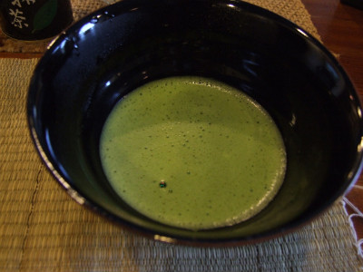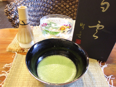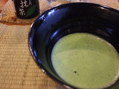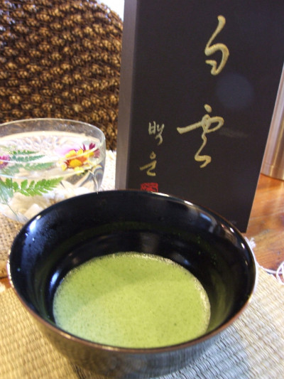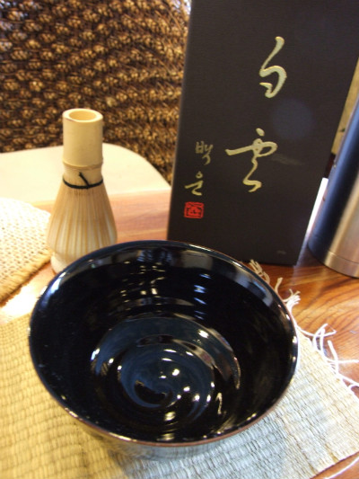 녹차 가루(말차)로 낸 차에 뜨거운 물을 붓고 다선(솔같이 생긴 것)으로 저어 차를 마십니다.