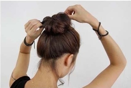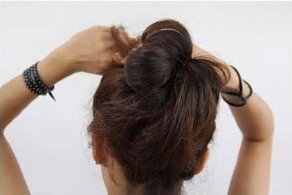 동그란 모양으로 어느정도 자리를 잡은 머리를 잡고 고무줄로 묶어줍니다