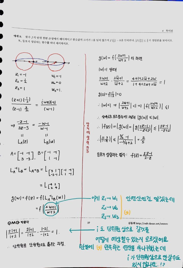 뫼비우스변환이 f라하면 그 f에 반사원리 적용할수 있으니까(계수가 다 실수라서).. 단위원이 단위원으로 가는거...! 라고 이해하면 맞나요? 😂 -