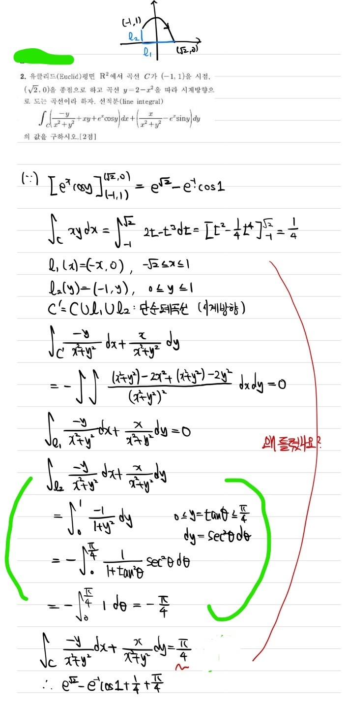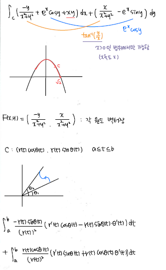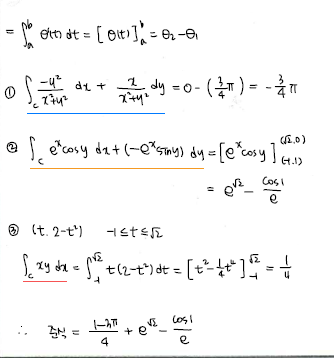 답댓글 작성자용용마마 작성자 본인 여부 작성자 작성시간 21.07.27 원점을 지나지 않게끔해서 곡선을 다시 잡아봤습니다. 자세하게 다시 풀어봤는데 (답은 파란색밑줄친 선적분값=(-3/4)파이 입니다.) 두리마루님께서도 지적을 잘 해주셨는데 제가 이해를 못했는지,, 답이 자꾸 빙빙돌아서요 ㅠㅠ