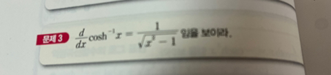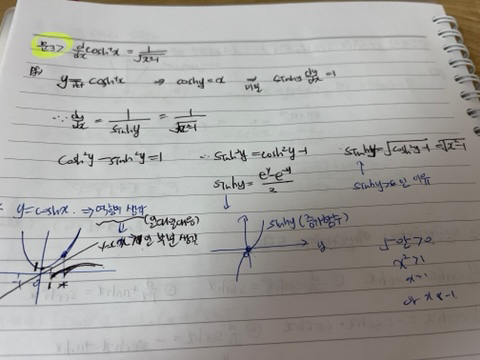 모범답안은 증가함수라 저렇다고 하는데요 sinhy>0인 이유가 제가 그린 것처럼 coshx가 x>1부분에서 역함수를 고려할수 있어서인지 궁금합니다 또한 x<-1인 경우는 고려 안하는지도 궁금합니다