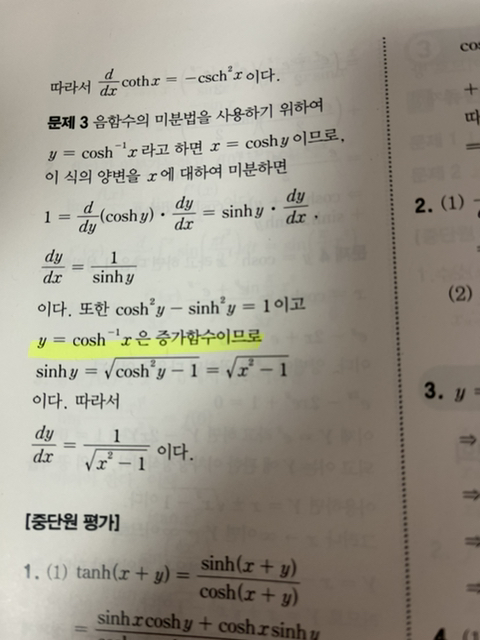 작성자신선물고기 작성시간 22.01.28 출처를 부탁드립니다. 'cosh x 가 x>1인 부분에서 역함수를 고려할 수 있어서' 라고 하는 부분은 'y=cosh x 의 역함수는 x ≥0 인 경우에 정의되어서' 또는 'y=Cosh^-1 x 는 x=cosh y , y≥0'과 동치라서 라고 하시는 것이 좋습니다. 또한 저기 책에 서술은 저리되어있지만 그렇게 이야기를 하기 보다는 y가 0이상이기 때문에 sinh y 또한 양이 되는것입니다. 이렇게 이야기 하는 편이 좋습니다.