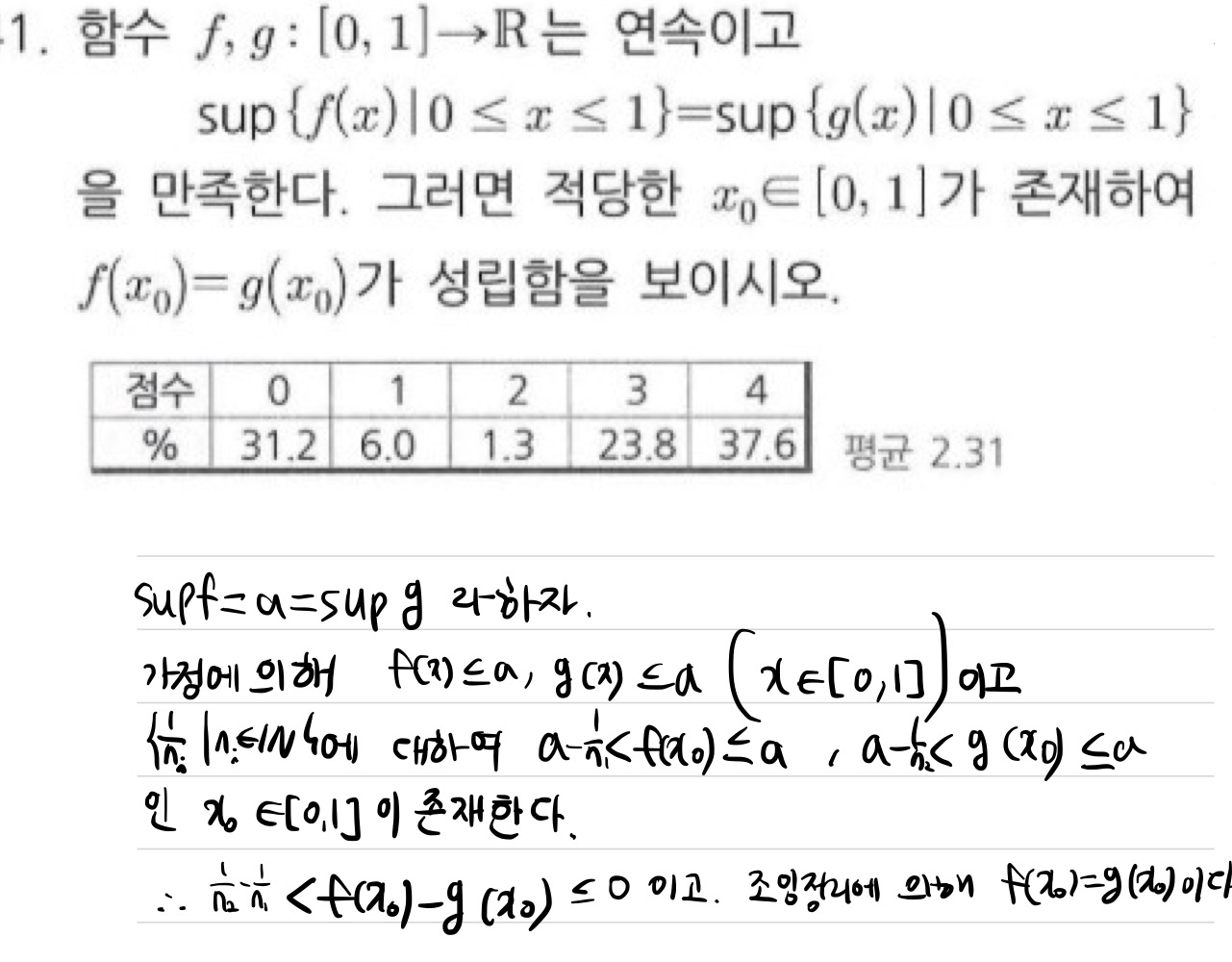 [해석학]상한 하한문제 작성자딩가딩가딩|작성시간22.02.21|조회수156 목록 댓글 3 글자크기 작게가 글자크기 크게가 안녕하세요 교수님!2022대비 정현민78문제풀이 해석학 41번 문제입니다!아래와 같은 방법으로 풀어도 괜찮은지 알고싶어요! 감사합니다 😊 다음검색 현재 게시글 추가 기능 열기 북마크 공유하기 신고 센터로 신고 댓글 댓글 3 댓글쓰기 답글쓰기 댓글 리스트 작성자신선물고기 | 작성시간 22.02.21 세번째줄부터 잘못입니다. 일단 ni 라는 변수설정도 어색한대 그건 어색한거라 치더라도. x0는 ni에 따라. 또한 f 와 g 에 대하여 각가 다를것인데 마치 하나의 수인양 서술하고있어요. 그래서 완전히 틀렸습니다. 답댓글 작성자딩가딩가딩 작성자 본인 여부 작성자 | 작성시간 22.02.21 그렇네요😭 자세한 설명 감사합니다!!😄 답댓글 작성자신선물고기 | 작성시간 22.02.21 딩가딩가딩 네 파이팅 하세요! 댓글 전체보기