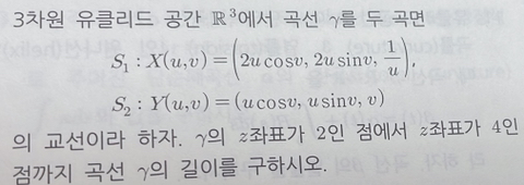 교선이 (1/t*cos2t, 1/t*sin2t, 2t) 라고 나오는데