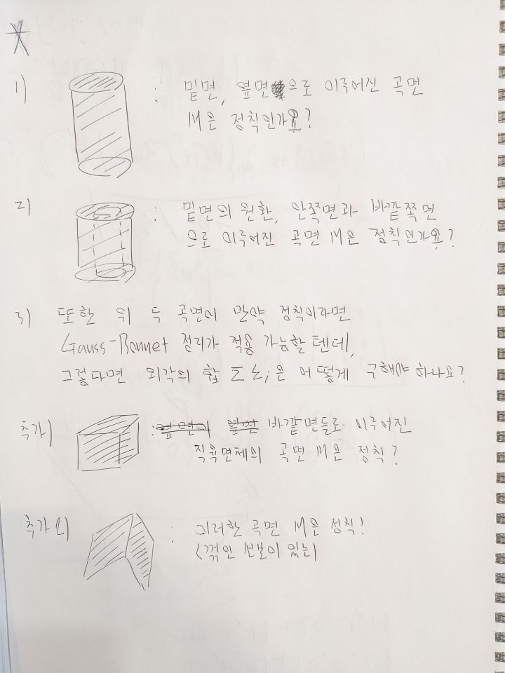 어떤 문제를 풀다가 원기둥 또는 가운데가 뚫린 휴지심 모양 원기둥에서 가우스 보네를 적용해서 푸는 문제가 나왔는데 제 생각에는 그러한 곡면들은 꺾인 부분이 있기 때문에 정칙이 아니라 생각했습니다